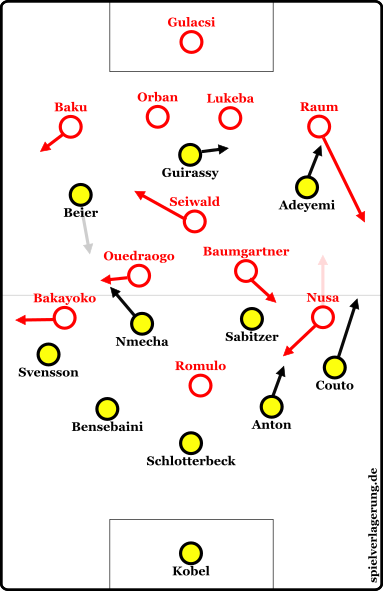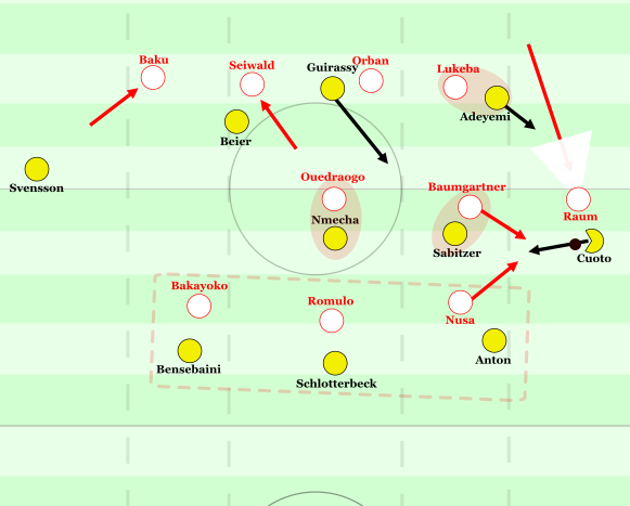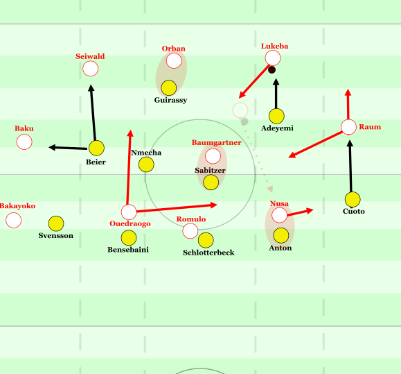 Interessant war gleichzeitig, dass durch das Herausrücken auf Couto nun der ballferne Außenverteidiger Baku in die Viererkette einschob. Auch Seiwald lockerte seine enge Mannorientierung auf Beier leicht, um als zweiter Innenverteidiger zu agieren und Orban zu ermöglichen, Guirassys Bewegungen im Zwischenlinienraum enger zu verfolgen. Gleichzeitig konnte Lukeba Adeyemis Bewegungen beobachten, die jedoch meist durch Coutos fehlendes Aufdrehen wirkungslos blieben. Einzig Guirassy konnte teilweise gesucht werden, doch gegen den sehr aggressiven Orban hatte der Stürmer insbesondere im Wandspiel Probleme. Auch die Achter steckten beim Freilaufen nach Wandspiel teilweise im Rücken von Ouedraogo und Baumgartner im Zentrum fest, sodass drucklösende Optionen fehlten. Allgemein agierte Beier etwas höher als gewohnt und weniger um Guirassy herum als verkappte falsche Neun, wodurch insbesondere in Bezug auf zweite Bälle und nach Wandspielen die direkte Unterstützung für Guirassy fehlte.