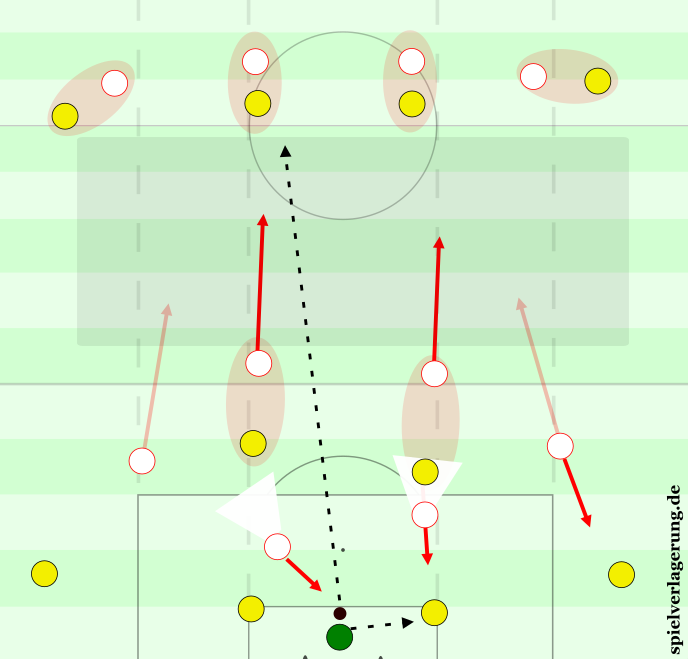 Zudem versuchten sich die Dortmunder Flügelspieler beim langen Ball zwar etwas von ihren Gegenspielern zu lösen, um für Ablagen anspielbar zu sein, doch die Leipziger Außenverteidiger verfolgten diese Bewegungen aufmerksam, wodurch das Ablagenspiel kaum möglich war. Auch die Flügelspieler Bakayoko und Nusa unterstützten das Leipziger Kollektiv durch ihr starkes diagonales Rückschieben in den Halbraum, was den Zugriff auf zweite Bälle nahezu permanent sicherte. Im Gegensatz dazu fehlte es dem BVB aufgrund der sehr tiefen Achter und der breitstehenden Außenverteidiger deutlich an Präsenz und Kompaktheit in der Sicherung der zweiten Ballphasen.