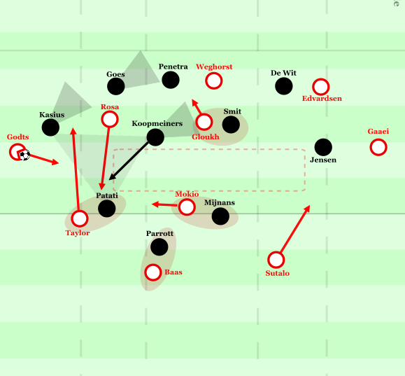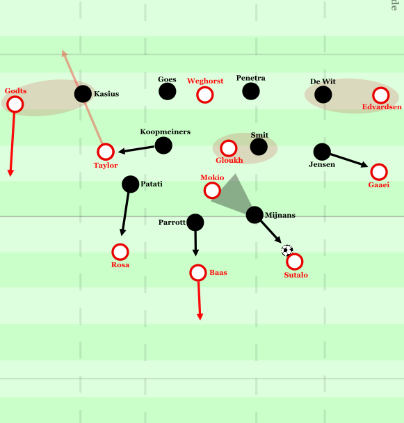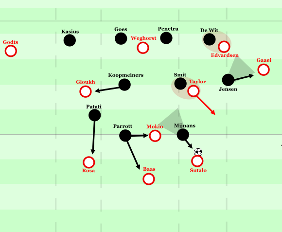 Zudem wurde Halbverteidiger Sutalo diagonal von Stürmer Mijnans angelaufen, wodurch der Passweg ins Zentrum gen Sechser Mokio und Zehner Gloukh weitgehend isoliert blieb. Der zweite Stürmer, Parrott, orientierte sich mannorientiert an mittleren Innenverteidiger Baas, während der ballferne Flügelspieler Patati parallel dazu Rosa enger zustellte. In der Folge tat sich Ajax schwer, innerhalb der Dreierkette drucklösend quer zu spielen. Baas ließ sich deshalb mehrfach weit zurückfallen, um sich aus Parrotts Markierung zu lösen. Dadurch musste Ajax nach jenen Querpässen insgesamt mit der Dreierkette tiefer aufbauen, was die gesamte 3-1-3-3-Staffelung in den Vertikalabständen auseinanderzog. Die Passwege verlängerten sich, die Abstände zwischen den Linien wuchsen – und damit verlor Ajax an Kontrolle in der Zirkulation.