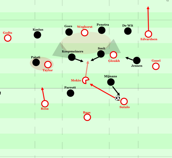 Das lag vor allem daran, dass Gaaei nach seinen anfänglichen Schwierigkeiten gegen Jensens diagonale Pressingwinkel im Verlauf der Partie immer höher agierte. Dadurch wurde jedoch der Passwinkel von Sutalo auf Gaaei so spitz, dass dieser praktisch nicht mehr anspielbar war. Die ursprüngliche Intention, Jensen durch flaches Überspielen zu umspielen, kehrte sich somit ins Gegenteil: Sutalo wurde vielmehr isoliert.Der Kroate war folglich auf unterstützende Bewegungen aus dem Halbraum angewiesen, die nach rund einer halben Stunde auch vermehrt kamen. Allerdings arbeiteten die Achter von AZ weiterhin sehr aktiv mit und verfolgten die Freilaufbewegungen der Halbraumzehner eng, sodass sich diese kaum aufdrehen konnten. Da Gaaei zudem sehr hoch stand (dadurch Horizontaloptionen fehlten), Mijnans den Rückpassweg auf Sutalo konsequent isolierte und Mokio von Parrott mannorientiert gedeckt wurde, führten diese Ballbesitzmuster im Halbraum kaum zu echter Entlastung oder Progression.