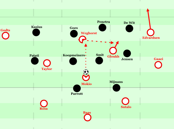 Das Problem lag anschließend jedoch in den fehlenden Anschlussoptionen: Die beiden Halbraumzehner Taylor und Gloukh wurden von den Achtern Alkmaars weitgehend isoliert, wenn sie sich zentral anboten, und standen Mokio zudem häufig im Raum, sobald dieser nach vorne andribbelte. Mokio tat sich in diesen Situationen schwer, den Ball frühzeitig unter Druck weiterzuleiten. Wenn sich Taylor und Gloukh stattdessen breiter positionierten, um Räume im Halbraum zu öffnen, wurden sie von den ballnah einrückenden Außenspielern konsequent zugestellt – wodurch die tiefen, diagonalen Verbindungen aus Mokios Andribbeln weitgehend unterbunden blieben.