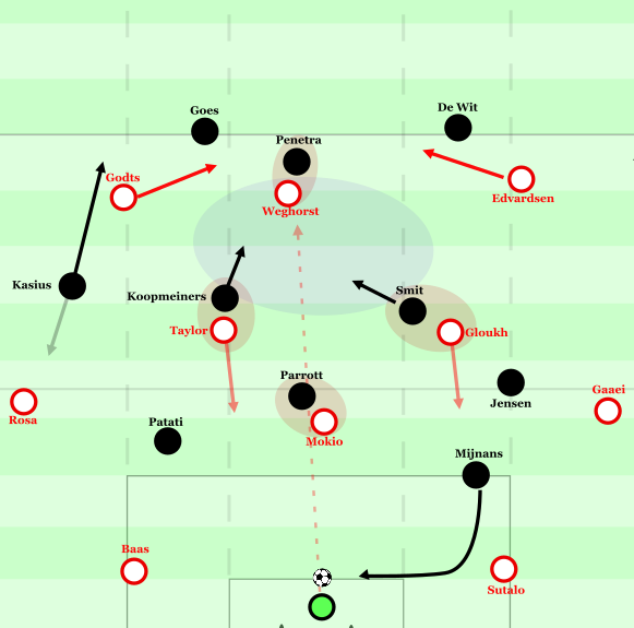 Zum anderen rückte der ballnahe Halbverteidiger im Aufbau häufig weit nach vorne oder schob selbst in den Zwischenlinienraum durch. Dadurch öffnete sich neben dem zentralen Innenverteidiger im Halbraum immer wieder ein diagonal bespielbarer Korridor, den der zweite Stürmer (Mijnans) oder situativ auch Patati konsequent anliefen. So hatte Parrott nach Ballgewinnen häufig eine direkte Ablageoption, um sofort Tiefe zu erzeugen.