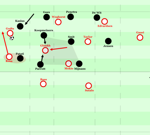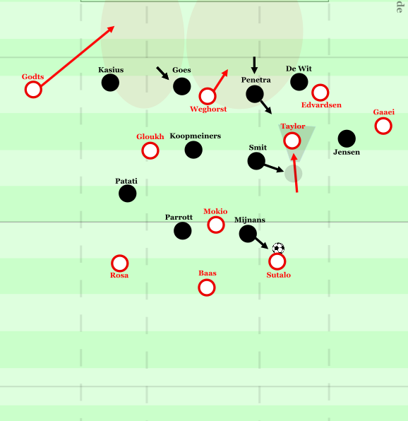 Zudem wurde Halbverteidiger Sutalo diagonal von Stürmer Mijnans angelaufen, wodurch der Passweg ins Zentrum gen Sechser Mokio und Zehner Gloukh weitgehend isoliert blieb. Der zweite Stürmer, Parrott, orientierte sich mannorientiert an mittleren Innenverteidiger Baas, während der ballferne Flügelspieler Patati parallel dazu Rosa enger zustellte. In der Folge tat sich Ajax schwer, innerhalb der Dreierkette drucklösend quer zu spielen. Baas ließ sich deshalb mehrfach weit zurückfallen, um sich aus Parrotts Markierung zu lösen. Dadurch musste Ajax nach jenen Querpässen insgesamt mit der Dreierkette tiefer aufbauen, was die gesamte 3-1-3-3-Staffelung in den Vertikalabständen auseinanderzog. Die Passwege verlängerten sich, die Abstände zwischen den Linien wuchsen – und damit verlor Ajax an Kontrolle in der Zirkulation.