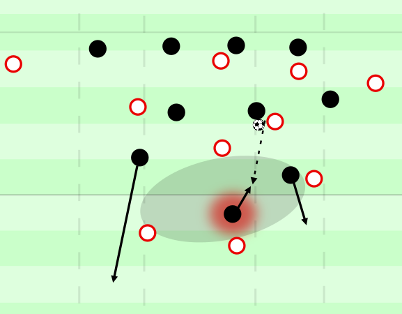 Darüber hinaus bewegte er sich durch seine halbräumige Positionierung in einem Zwischenraum zwischen den beiden Achtern und den beiden Stürmern von AZ, wodurch eine kleinräumige Ballung um Gloukh herum entstand. Wäre er in diesen Zonen angespielt worden, hätte AZ sofort mit Rückwärtspressing der Stürmer und nachschiebenden Achtern reagiert, was Gloukh kaum Handlungsspielraum im Anschluss verschafft hätte.