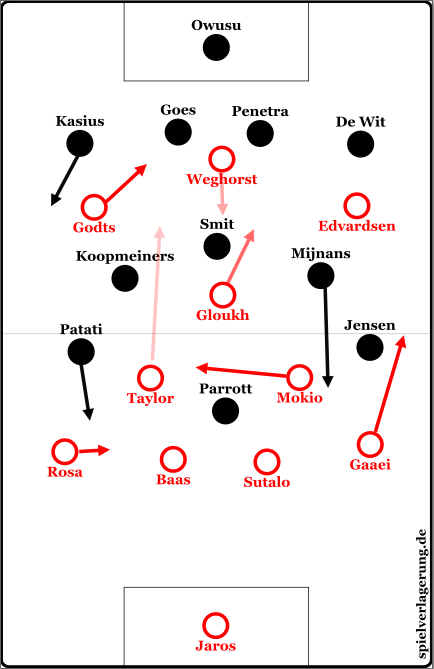 Das lag vor allem daran, dass Gaaei nach seinen anfänglichen Schwierigkeiten gegen Jensens diagonale Pressingwinkel im Verlauf der Partie immer höher agierte. Dadurch wurde jedoch der Passwinkel von Sutalo auf Gaaei so spitz, dass dieser praktisch nicht mehr anspielbar war. Die ursprüngliche Intention, Jensen durch flaches Überspielen zu umspielen, kehrte sich somit ins Gegenteil: Sutalo wurde vielmehr isoliert.Der Kroate war folglich auf unterstützende Bewegungen aus dem Halbraum angewiesen, die nach rund einer halben Stunde auch vermehrt kamen. Allerdings arbeiteten die Achter von AZ weiterhin sehr aktiv mit und verfolgten die Freilaufbewegungen der Halbraumzehner eng, sodass sich diese kaum aufdrehen konnten. Da Gaaei zudem sehr hoch stand (dadurch Horizontaloptionen fehlten), Mijnans den Rückpassweg auf Sutalo konsequent isolierte und Mokio von Parrott mannorientiert gedeckt wurde, führten diese Ballbesitzmuster im Halbraum kaum zu echter Entlastung oder Progression.