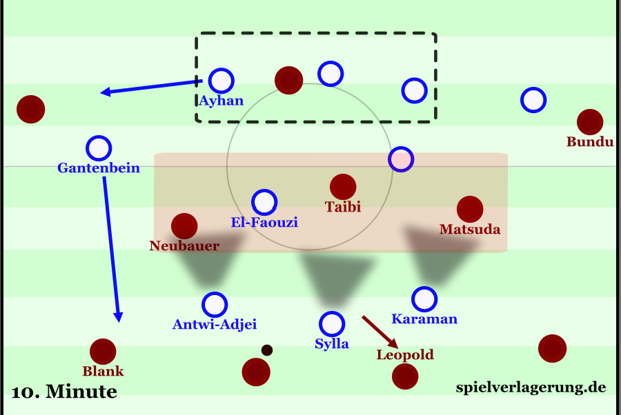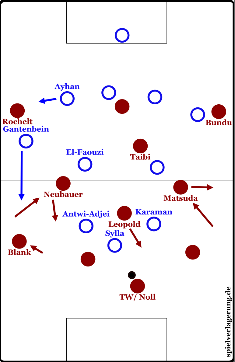 Hannover verpasste es auch in den folgenden 20 Minuten die Schwächen des Schalker Angriffs-Pressings gezielt auszunutzen. Zum einen mussten Gantenbein und Ayhan ihre Gegenspieler übergeben und hatten lange Pressingwege. Ayhan, rechter Innenverteidiger der Schalker Dreierkette, musste den ganz breit positionierten Rochelt übernehmen, während Gantenbein den häufig flach in der Breite positionierten Blank übernehmen musste. Die Schalker sind sich dieser Schwäche bewusst, weshalb Gantenbein mit Deckungsschatten auf den breit positionierten Rochelt anlief, wodurch Ayhan länger Zeit für die Übergabe blieb.