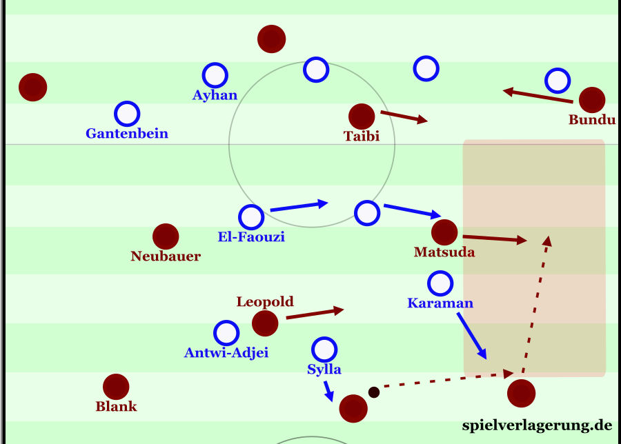 Zum anderen schaffte es Hannover nicht, die zentrale Überzahl durch 10er Taibi oder Sechser Leopold auszunutzen. Dieses Problem bestand ebenfalls gegen das Schalker Mittelfeldpressing, weshalb die Möglichkeiten, über das Zentrum zu spielen, in diesem Artikel in einem späteren Abschnitt nochmal ausführlicher behandelt werden. Da Hannover kaum das Zentrum bespielen konnte, wurden immer wieder Möglichkeiten um den Block herum gesucht. So wurde durch das 3-Raute-3 die Außenbahn geöffnet. Insbesondere Matsuda lief nach der Verlagerung auf seine ballnahe Seite immer wieder von innen nach außen und wurde entlang der Außenlinie gefunden. Dieser Laufweg hat allerdings den Nachteil, dass bei Erhalten des Balles die Körperstellung in Richtung der Außenbahn geneigt ist, wodurch schwieriger von außen wieder das Zentrum gefunden werden kann.
