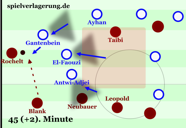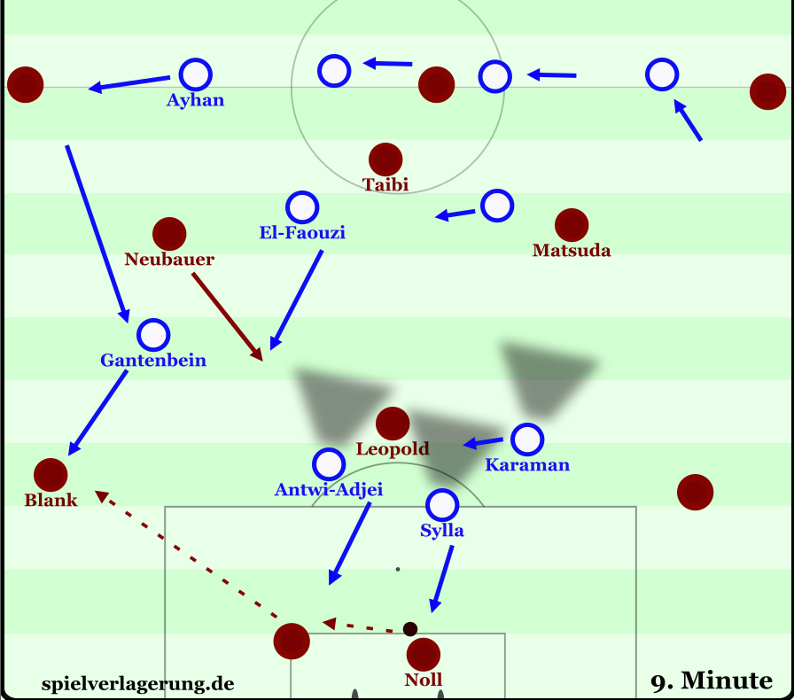 Die individuellen Zuordnungen der Schalker waren bereits in der ersten Pressingsituation klar. Die vorbereiteten Zuordnungen wurden für außenstehende an den Blicken der Pressingspieler auf ihren jeweiligen zu übernehmenden Gegenspieler sichtbar. Außenverteidiger Gantenbein ließ sich nicht von dem in die Halbspur startenden Außenverteidiger Neubauer weglocken, sondern schob durch auf den breit schiebenden Blank. Neubauer wurde dafür sofort von dem ballnahen Sechser El-Faouzi übernommen. Gleichzeitig schoben der ballferne Halbraumstürmer und der ballferne Sechser ein, wodurch ballnah aus dem -2 Anlaufen eine Gleichzahlsituation mit engen Manndeckungen entstand. Die folgende Balleroberung, ausgelöst durch den hohen Druck auf Neubauer führte zum 1:0.