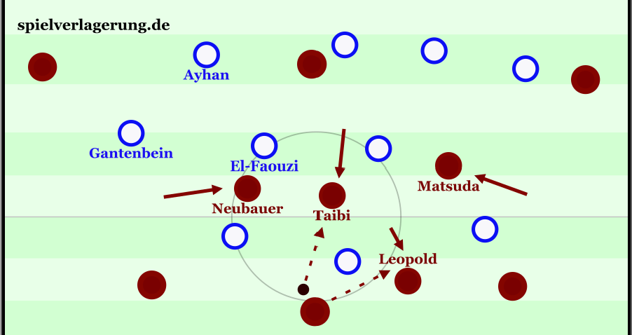 Sinnvoll hätte ebenfalls ein häufigeres, stärkeres Fallenlassen von 10er Taibi sein können. Durch die Abkippbewegungen und den Ballbesitz in der Aufbauzone, hätte er als freier Spieler häufiger in den Zwischenkettenräumen anspielbar werden können und dadurch Sechser El-Faouzi vor die Zwickmühle zwischen Neubauer oder Taibi verteidigen, gestellt. Häufig positionierte sich 10er Taibi allerdings im Zwischenkettenraum zwischen Abwehr und Mittelfeld. Dadurch wurde er nicht direkt flach anspielbar. Ebenso hätte der Zwischenkettenraum zwischen Abwehr und Angriff durch eine diagonale Anspielstation des ballfernen, eingerückten Außenverteidigers besetzt werden können. Die ballferne Seite der Mittelfeldraute blieb ungenutzt, da Hannover versuchte, über Verlagerungen die eingeschobenen Außenverteidiger um den Block herum anzuspielen. Sinnvoller wäre es möglicherweise gewesen, die Außenverteidiger diagonal durch das Zentrum anspielbar zu machen.