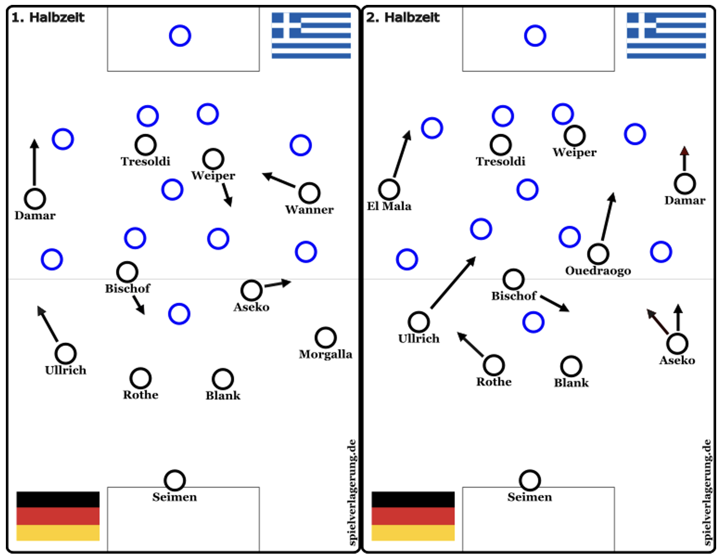 Gegen das mannorientierte Pressing der Griechen entwickelten die deutschen in der ersten Halbzeit nur selten Lösungen. Exemplarisch wie im Bild links, wurde das Spiel auf eine Seite gelenkt, wo ein 8er aus dem 4-1-4-1 als 2ter Stürmer einen hohen Ballgewinn provozieren wollte. Morgalla wurde hierbei vom linken Flügelspieler angelaufen und Aseko löste sich aus seiner zentralen Position wobei dieser vom 6er übernommen und zugestellt wurde. Die Herangehensweise im Pressing der Griechen mit anhaltender Statik der deutschen Mannschaft sorgte so vor allem in der ersten Hälfte für ein Spiel mit wenig Kombinationsspiel und Ideenvielfalt der deutschen Mannschaft.