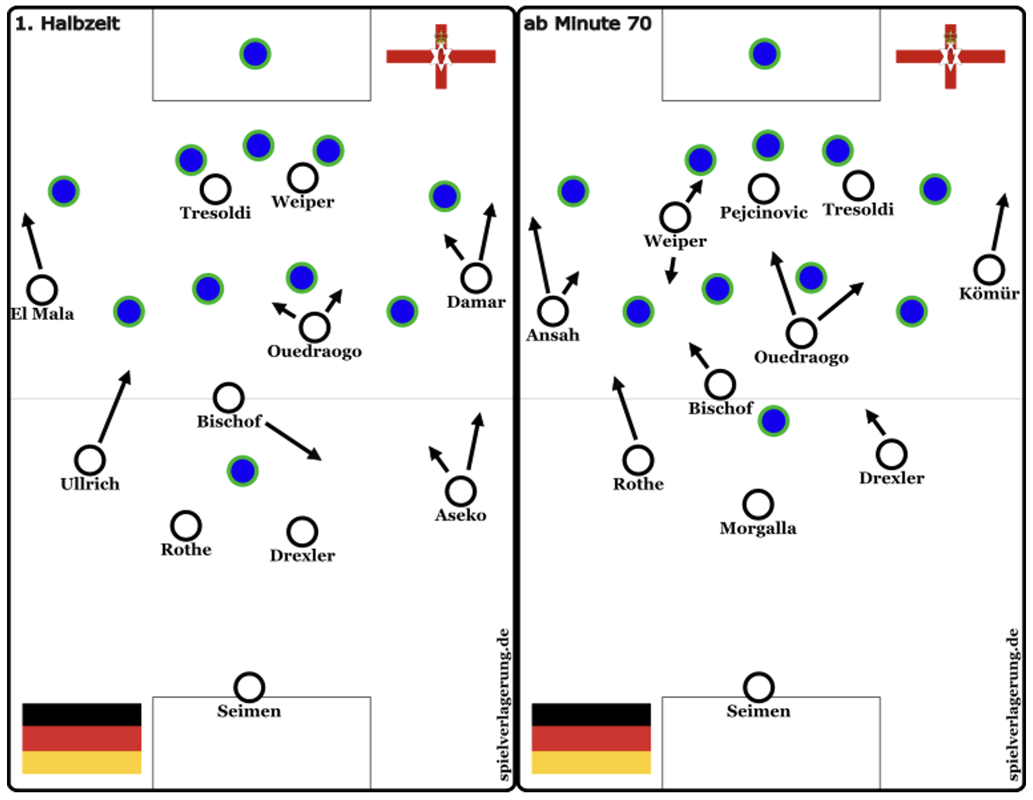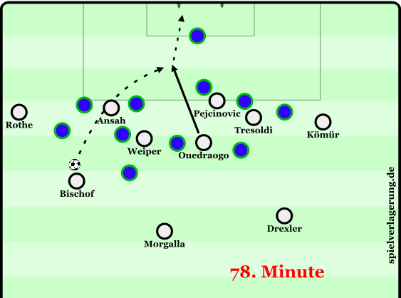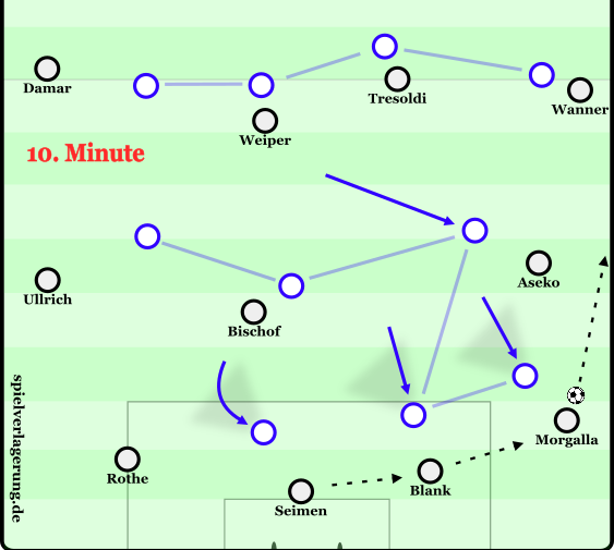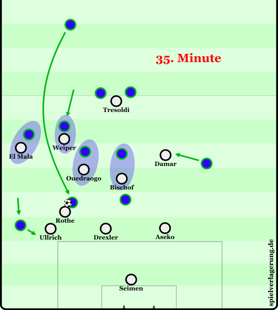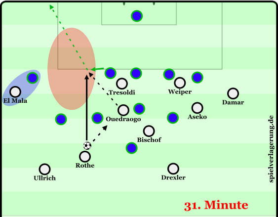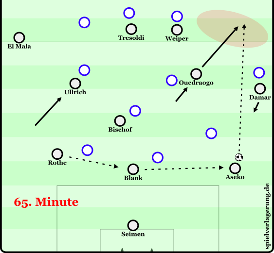Zu Beginn der 2. Hälfte konnte mithilfe der Positionsanpassung von Ullrich, der zunehmend invers (ins Zentrum ziehend) mit Ball agierte und der Hereinnahme von El Mala und Ouedraogo das Spiel dynamischer kreiert werden. Ullrichs Position konnte die beiden Verteidiger der Mittelfeldkette eng im Halbraum binden, öffnete für den breiter agierenden Rothe den Pass auf El Mala, der seine Stärke im 1vs1 gegen den Außenverteidiger ins Spiel bringen konnte. Auf der rechten Seite spielte von nun an Aseko, der seine Rolle flach interpretierte. Ebenfalls flacher als in der ersten Hälfte agierte Damar, so konnten asynchron zur linken Seite 2 Spieler breit gebunden werden. Durch diese Anpassung konnte Raum auf der rechten Angriffsseite erzeugt werden, in den Ouedraogo mit tiefen Läufen immer wieder das Spiel öffnete.
