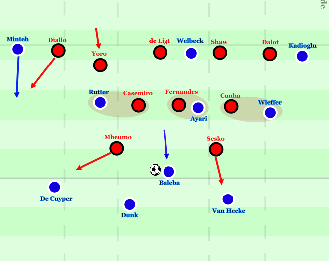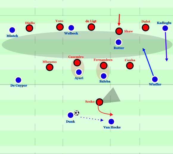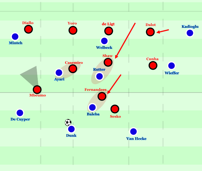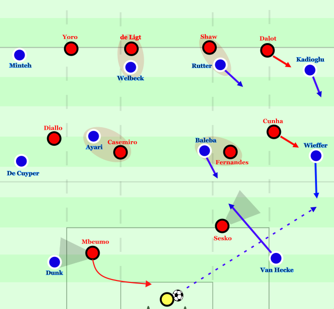 Grundsätzlich impliziert das Provozieren eines bestimmten Passes stets, dass man alternative Optionen isolieren sollte – und genau das setzte United in der Anfangsphase um: Einerseits orientierten sich die Achter Casemiro und Fernandes eng mannorientiert an Baleba und Ayari, andererseits versuchte Šeško aus einer halbrechten Grundposition den Diagonalpass von Dunk auf Rechtsverteidiger Wieffer zu unterbinden. Diese strukturellen Absicherungsmechanismen gewährleisteten United den notwendigen Trigger, um aus dem Blocken heraus aktiv ins Pressing überzugehen.