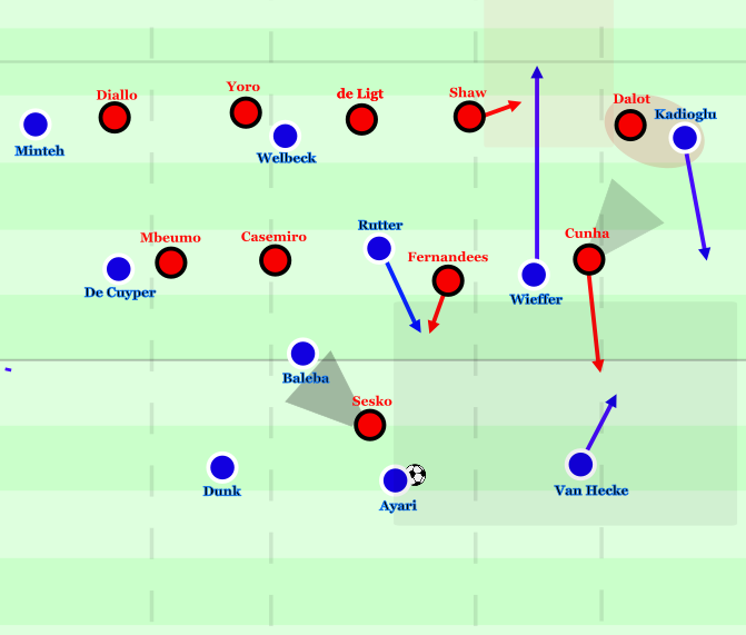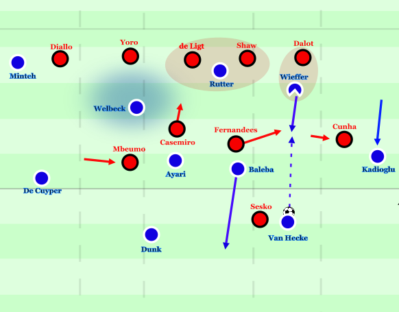 Da Baleba weitgehend gegen Fernandes im rechten Halbraum isoliert war – Fernandes wählte bewusst die Außenseite seiner Mannorientierung, um Baleba für das Horizontalspiel aus der Breite zu isolieren – war Wieffer darauf angewiesen, den Vertikalpass auf Kadioglu zu suchen. Diese Vorhersehbarkeit hatte zur Folge, dass Dalot extrem aggressiv und direkt auf Kadioglu mitschob, wodurch dieser Probleme im 1-gegen-1 hatte. Das konsequente Verfolgen der Bewegungen von Wieffer durch Cunha sowie die enge Mannorientierung Shaws gegen Rutter führten schließlich dazu, dass Kadioglu aufgrund fehlender Folgebewegungen mehrfach den Ball gegen Dalot verlor.