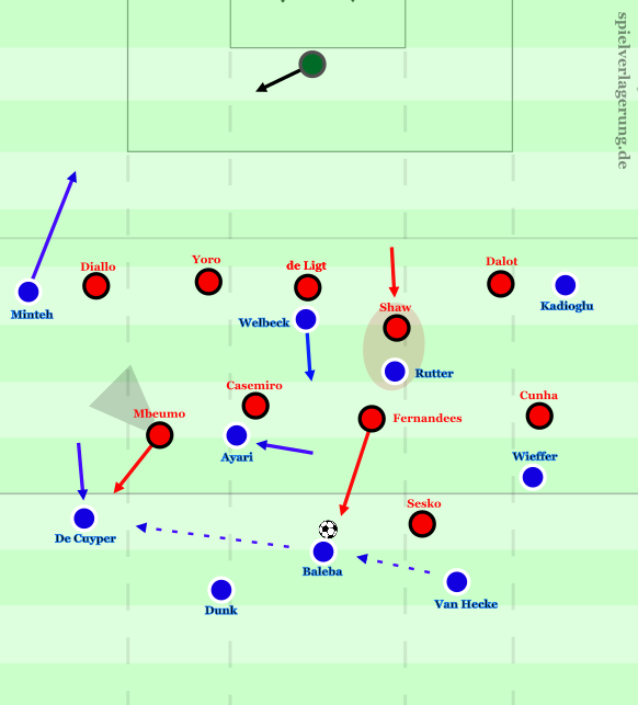 Zunehmend kamen Balebas Ausweichbewegungen jedoch früher und nicht erst nach van Heckes Andribbeln, sodass er mehrmals zentral aus diesen Bewegungen heraus angespielt werden konnte. Vorbereitet wurden diese Aktionen durch tiefere Positionierungen von Zehner Rutter im rechten Halbraum, wodurch er Fernandes – ursprünglich Balebas direkter Gegenspieler – band. Entsprechend schob Fernandes erst mit Verzögerung diagonal heraus, sobald Baleba angespielt wurde, während Shaw die Zuteilung auf Rutter übernahm. Durch den langen diagonalen Pressingweg konnte Fernandes allerdings nur bedingt Druck auf den aufdrehenden Achter ausüben.