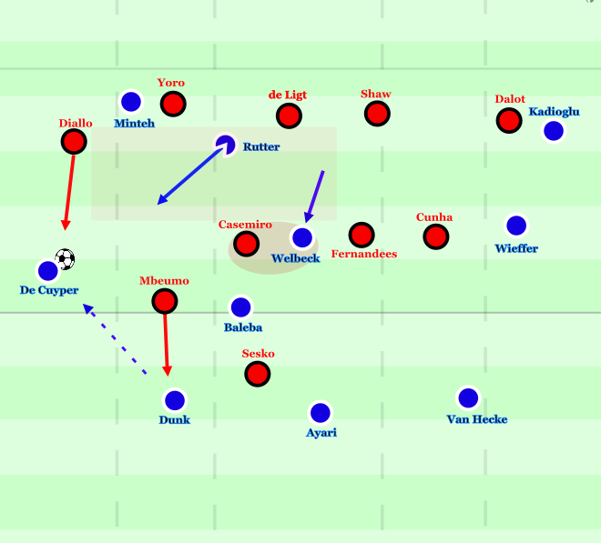 Gerade auf der linken Seite, wo Linksverteidiger De Cuyper noch stärker und konstanter die Breiten besetzte als sein Pendant auf rechts, musste Flügelverteidiger Diallo nun sehr weit und vertikal nach vorn durchschieben, um den Außenverteidiger anzupressen. Der dabei entstehende, deutlich vertikale Pressingwinkel isolierte jedoch primär den unmittelbaren vertikalen Passweg in der Breite, aber nicht den Diagonalpassweg nach innen. Dadurch, dass Achter Casemiro vorbereitend – durch Abkippbewegungen Welbecks beim Ballspiel von MIV Ayari, isoliert war, zog infolge der Stürmer (hier Rutter) diagonal in den Halbraum. Da Innenverteidiger de Ligt diese Bewegungen kaum aktiv verfolgte und Halbverteidiger Yoro an Minteh gebunden war durch Diallos Herausschieben, agierte Rutter so ohne direkten Gegenspieler im Zwischenlinienraum und konnte das Dribbling suchen. In diesen Mustern wurde Brighton am gefährlichsten.