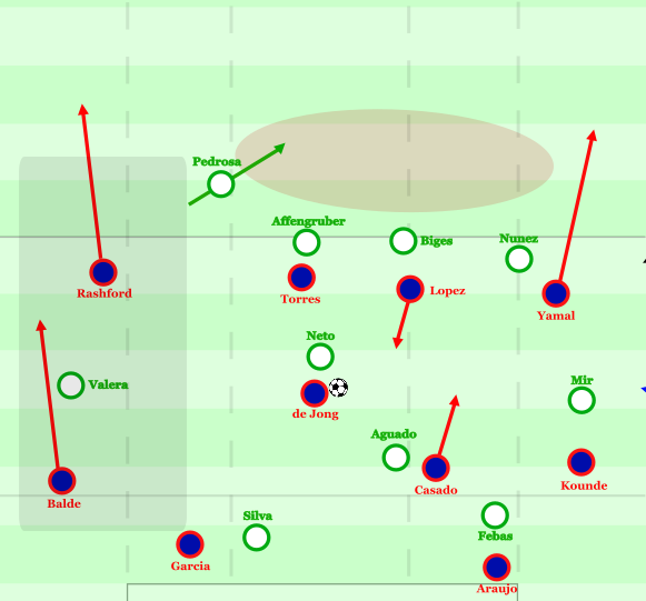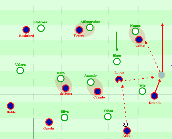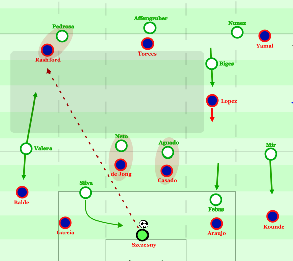 Die Pärchenbildung im letzten Drittel führte immer wieder dazu, dass die Außenverteidiger hinterliefen, während die Flügelspieler den Ball hielten. Dies unterband mehrmals das Herausverteidigen von Núñez und Pedrosa durch die Tiefenbindung und ermöglichte so den inversen Dribblingweg, aus dem Rashford und Yamal mehrmals ihre Abschlüsse über die typischen inversen Wege suchen konnten. Unter anderem entstand daraus eine nicht kleine Chance für Rashford in Minute 35, wo er knapp das lange Eck verfehlte.