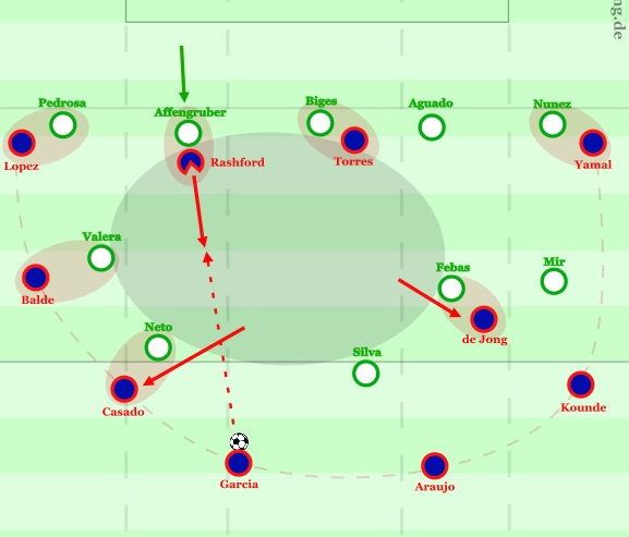 Dahingehend sah man eher Barcelona zunehmend auch wieder aus dem höheren Spielaufbau heraus, wo man aus dem 2-4-4 die klare Intention hatte, über die diagonal in die Breite abkippenden De Jong und Casado die Achter aus Elches 5-4-1-Mittelfeldpressing mitzuziehen und darüber Optionen im Halbraum für die Innenverteidiger zu öffnen sowie ein extremes Loch im Zentrum zu ziehen. Dies führte einerseits dazu, dass man teils extrem weite Andribbelmomente, gerade von Araujo, sah, oder auch die typischen Druckspiele auf Rashfords Abkippen im Halbraum in den extrem großen Zwischenlinienraum im Zentrum.
