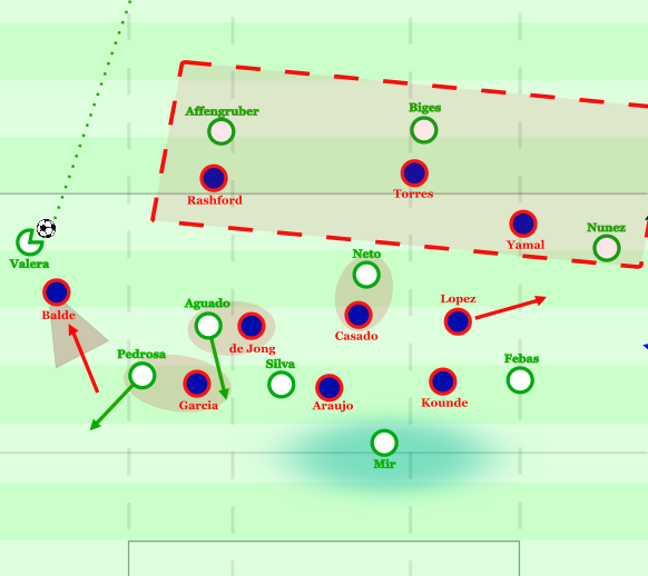 Das Problem: Der Punkt, wann er die Sicherung suchte, war klar definiert – nämlich das Auslösen des langen Balles -, aber der Punkt, wann er zurück in die Manndeckung gegen Rashford ging, nicht. Dadurch stand er mehrmals weit hinter der Verteidigungslinie, während der Ball schon wieder bei Barcelona im Umschalten war. So hatte Rashford bei seinen breiten Tiefenläufen einen extremen Dynamikvorteil, und gerade weil Balde ebenfalls nachschob, entstand so gegen Flügelspieler Valera mehrmals ein 1-gegen-2 in der Breite, was Barcelona nach Ballgewinnen direkt zu bespielen suchte – und auch bei beiden Toren fand. Das Umschalten eingeleitet hat meistens entweder López im Entgegenkommen – gerade durch seine Beidfüßigkeit konnte er daraus mehrmals direkt in die Breite aufdrehen und die Tiefe mit Rashford bespielen – oder auch Caicedo schob unterstützend nach. Hier agierte Aguado bei etwaigen Ping-Pong-Situationen im Mittelfeld teils etwas zu ballorientiert-einrückend und verlor seinen Gegenspieler im Rücken.