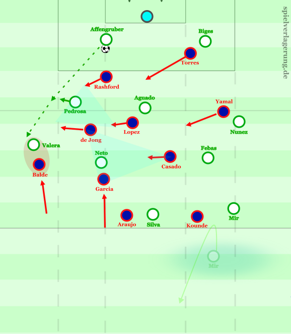 Diese Problematik spürten auch die Innenverteidiger von Barça schon nach wenigen Minuten, wodurch sie sich noch breiter postierten. Gerade Araújo agierte nun in der Breite mit Koundé. Daraus konnte man zwar den Pressingwinkel der Stürmer dahingehend bearbeiten, dass er etwas diagonaler wurde, woraus man teils direkt den Pass vom Innenverteidiger auf abkippende Flügelspieler suchen konnte, aber weiterhin tat sich gerade Rashford gegen Pedrosa sehr schwer. Grundsätzlich ergab sich durch die indessen noch breiteren Innenverteidiger durchaus teils die Option, dass man es im 2-gegen-2 bspw. im Spielen&Gehen ausspielt, aber bislang fehlte etwas der Mut, die Außenverteidiger unter direkten Gegnerdruck anzuspielen – obwohl gerade Balde durchaus die Anlagen besessen hätte, sich auch daraus mit Dribbling gegen Valera zu lösen.