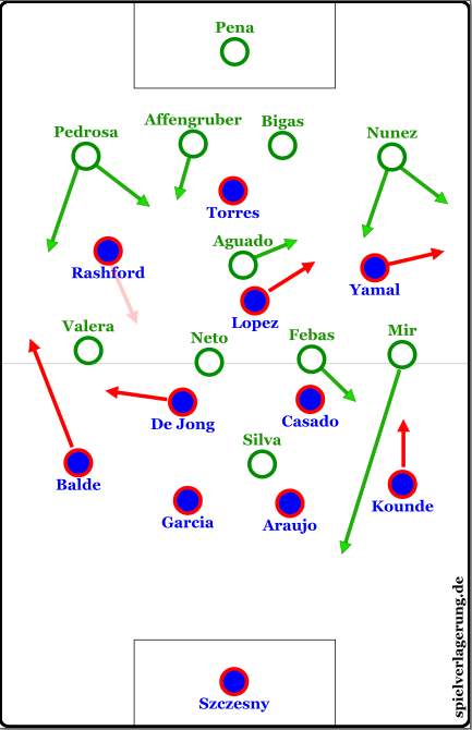 Der FC Barcelona kam aus einer Niederlage im El Clásico, auch bei Spielverlagerung doppelt aufgearbeitet, mit einer 4-2-3-1-Grundformation: Araújo und García agierten als Innenverteidiger, daneben agierten Balde und Koundé. Caicedo und De Jong agierten als Achter, Yamal und Rashford wie gewohnt als Flügelspieler und dazwischen López. Torres agierte als Stürmer.