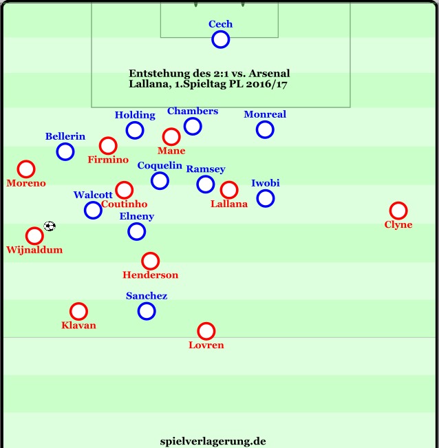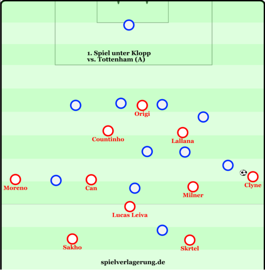 Im Verlauf der Entwicklung, in der immer klarer allein ein 4-1-2-3 praktiziert wurde, zog Liverpool gegen einen Mid-Block sein gegenpressinggeprägtes Ballbesitzspiel auf. Im Zentrum rotierten Can und Coutinho häufig: der ballsichere Coutinho übernahmen die zentrale Rolle für den Übergang, während der defensiv weiträumige Can als Zehner agierte. Zu Beginn verteidigte Liverpool noch sehr aus der jeweiligen Formation in Ballbesitz, sodass übliche Formationslücken auch Gegenpressinglücken bedeuteten. Zum Beispiel hatte Liverpool aus einem üblichen 4-3-3 Probleme die Flügel hinter ihren durchpressenden Außenverteidigern zu verteidigen, wenn die Innenverteidiger zentral gebunden waren oder der Zeitpunkt des Abspiels nach außen so nah am Ballverlust lag, dass ein Durchsichern zum Flügel nicht rechtzeitig erfolgen konnte. Hier wären wir wieder beim Rhythmus: aus welcher Breite spielen die Innenverteidiger nach außen und wie gut ist ein Ballverlust dort gegenpressinggeeignet? All das ohne im Spiel mit Ball in andere Abläufe zu kommen (breitere Innenverteidiger = andere Aufbauwinkel = andere Abläufe). Im Verlauf der Entwicklung gelang es Liverpool die Staffelungen in Ballbesitz schwarmintelligenter zu gestalten – in allen Linien. In der Aufbaulinie positionierte sich Liverpool vermehrt mit drei Aufbauspielern, sobald man früh den Außenverteidiger mit der Intention des tiefen (riskanten – ballverlustgefährlichen) Passes anspielte.