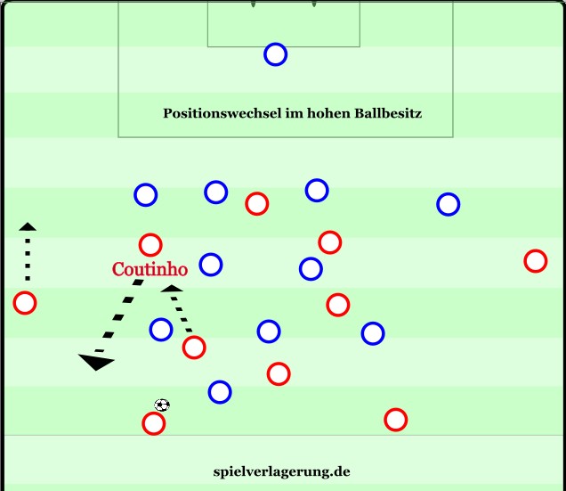 Ein weiterer Aspekt in diesem Zusammenhang sind die Positionswechsel, die Klopp gezielt einsetzte. Spieler, die eher für das Jagen und Gegenpressen geeignet waren (z. B. physisch stark, mit großem Raumgriff), rückten höher, während technisch starke, pressingresistentere Spieler wie Coutinho sich tiefer fallen ließen, um Dribblings einzuleiten. Diese dynamischen Positionswechsel hatten gleich mehrere Effekte: Sie schufen neue Pass- und Dribbellinien, indem sie Räume öffneten oder Gegner herauszogen. Sie verbesserten die Anschlusspositionen im Gegenpressing, da Spieler sich bereits in Richtung Ballbewegung orientierten. Sie ermöglichten es, das Dribbling aus günstigen Winkeln und Räumen zu starten – besonders aus dem Halbraum, wo Kombinationen aus Dribbling, Ablage und Tiefenpass entstehen konnten.
