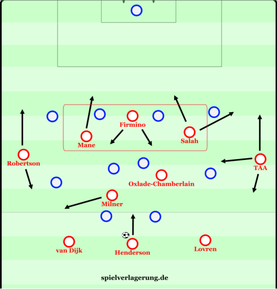 Ziel war es, viele Bindungen vertikal zu schaffen, Räume am Flügel zu öffnen, aufzudrehen und dann zu verlagern. Quasi nach dem Motto: „freien, ballfernen AV aufgerückt finden“, wobei der ballferne Achter durch kreuzende Läufe die letzte Linie band und diese Verlagerungen dynamisch und gut abgestimmt ermöglichte. Verlagerungen braucht jede weiträumige Ballbesitzmannschaft. Verlagerungen bergen Risiken, wenn sie zu Lasten von Stabilität/Gegenpressing gehen (weil bspw.  zu wenig Spieler, zentral, hinter dem Ball sind oder der Moment der Verlagerung meist der Moment des offenen Ballverlustes wird). Verlagerungen, die sehr auf Stabilität bedacht sind, verlieren aber ihre Offensivpower bzw. offensiven Wert gegen die gegnerische Defensivsystematik wenn die Anschlussoptionen fehlen. Liverpools Idee, Verlagerungen als Mittel aus Überladungen (also als mögliches, nicht als zwingendes, zweckentfremdentes Outocme) durch eine offene Drehung eines ballsicheren Spieler zur Verlagerungsseite (Pressingresistenz) und synchrones Aufrücken und Binden eines absichernden Spieler, der bei allen Ballverlustszenarien bis zum Verlagerungspass im Gegenpressing mithelfen kann und bei eben dieser Verlagerung dynamisch Räume öffnet, funktionierte meist gut.