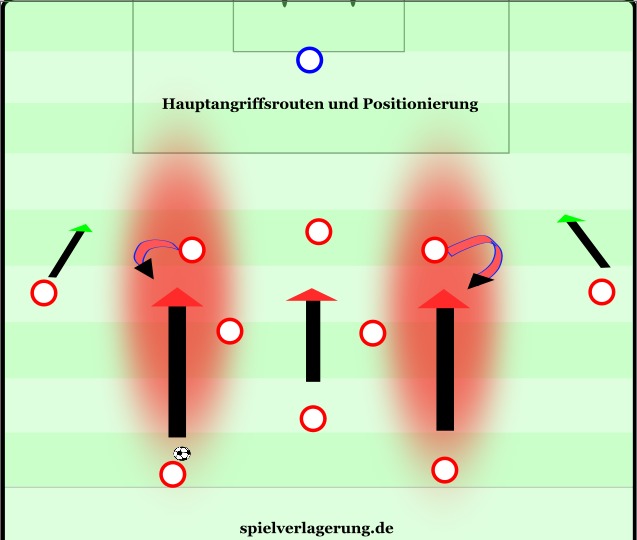 • Formationsflexibilität: bei offenen Flügeln rückt Mittelfeld nach außen oder der Aufbau wird zur Dreierlinie durchgeschoben (Formationslücken lösen oder funktionslose +1-Überzahl in letzter Linie dynamisch nutzen)