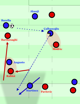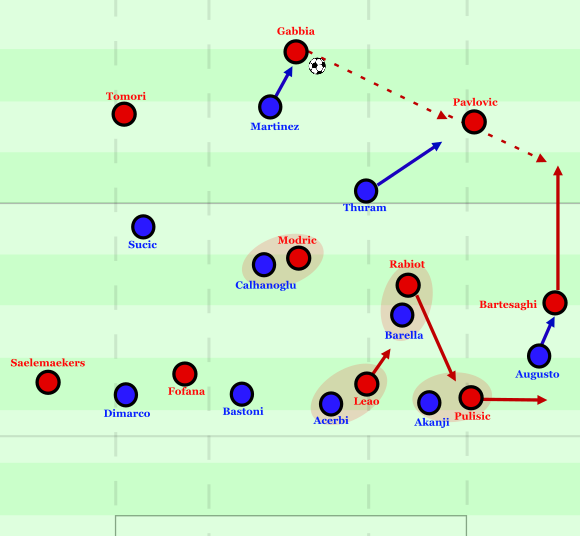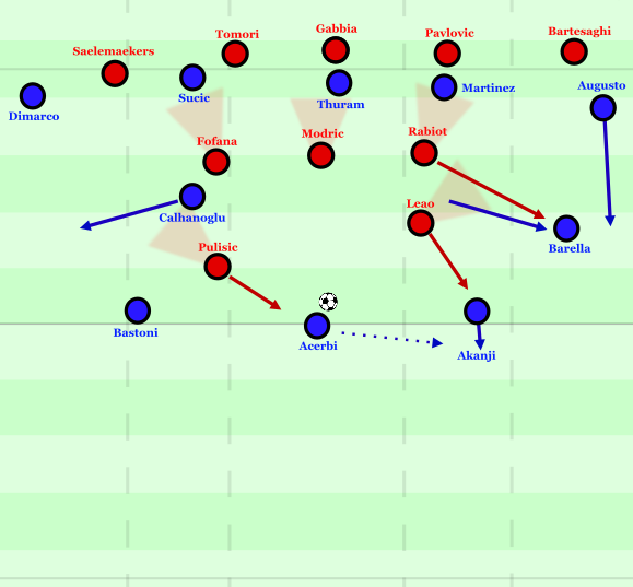 In den ersten Minuten musste Barella sich dann mehrmals diagonal in den ballfernen Halbraum zu Bastoni lösen. Dieser Passweg wurde immer wieder frei, weil Pulisic im Restpressing stark mannorientiert auf Çalhanoğlu agierte und sich daher oft tiefer fallen ließ. Er tat dies vor allem, um Modrić die Absicherung des Raums vor der Abwehrlinie zu erleichtern und darüber auch immer mal wieder flexibel in Zwischenräume fallen zu können, wenn ein Halbverteidiger mannorientiert herausschieben musste. Dadurch entstanden jedoch Zwischenräume zwischen Leão und Pulisic, die sowohl Barella als auch später Augusto immer wieder für drucklösende Rückpässe nutzen konnten.