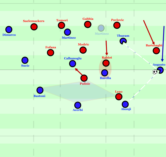 In den ersten Minuten der zweiten Hälfte änderte sich grundsätzlich wenig am Spielgeschehen. Inter fand jedoch aus dem tiefen Aufbau über die zunehmend in der Breite agierenden Barella und Sucic sowie den horizontal sich anbietenden Çalhanoğlu die diagonal durchschiebenden Stürmer. Durch die diagonal durchbrechenden Läufe von Inter rückten die Flügelverteidiger von AC vertikal heraus, während die Schienenspieler von Inter an die eigenen Achter, die initial halbräumig agierten, übergeben wurden. Durch diesen diagonalen Winkel, in dem Rabiot auf Augusto herausrückte, konnte er kaum den Raum in seinem Rücken verteidigen, den Inter über Çalhanoğlu und den diagonal durchtreibenden Martínez bespielte – der Diagonalpass war nur möglich, weil Rabiot aus dem Halbraum herausschob.