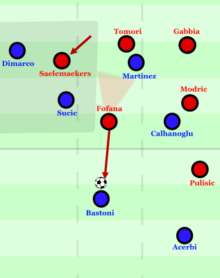 Der AC Mailand war auf diese Muster jedoch vorbereitet. So agierte der ballferne Achter Fofana nach solchen Rückpässen in den ballfernen Halbraum immer wieder temporär als dritter Stürmer und schob vertikal auf Bastoni heraus, um dessen Passoption in den Halbraum zu isolieren. Dafür löste er allerdings seine Mannorientierung auf Šučić auf. Das hatte zur Folge, dass Saelemaekers in der rechten Breite zunehmend in 1-gegen-2-Unterzahl gegen Dimarco und Šučić verteidigen musste. Er löste dies jedoch clever: Er schob diagonal zwischen die beiden Inter-Spieler, sodass er einerseits Zugriff auf Šučić vor sich herstellen konnte, gleichzeitig aber auch direkt Druck auf Dimarco im Dribbling ausüben konnte. Durch diese Positionierung konnte Bastoni die potenzielle Überzahl auf der linken Seite kaum bespielen.