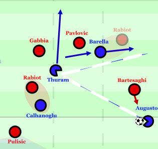 Zudem besetzte Inter später immer wieder den Raum hinter Bartesaghi. Besonders Barella lief aus hoher Grundposition im Halbraum horizontal hinter Bartesaghi, wodurch er für Thuram im Rücken des Flügelverteidigers diagonal anspielbar wurde. Zwar bewegte sich Rabiot teilweise mannorientiert mit Barella in die Verteidigungslinie (später kaum noch, da er häufig durch Çalhanoğlu zentral gebunden wurde), dennoch konnte er Barellas Zuspiele kaum unterbinden. Durch das horizontale Hinterlaufen erhielt Barella einen deutlich besseren Winkel für das Diagonalspiel, eine gute Vororientierung zum Lösen vom direkten Gegenspieler, und konnte sich mehrfach aufdrehen. Besonders brenzlig wurde dies, weil Thuram nach seinen Ablagen meist direkt vertikal im Halbraum mittels Spielen&Gehen durchschob, was für Gabbia und Pavlović gefährlich war, da sie im Antritt einen Nachteil gegen den Franzosen hatten. Dadurch konnte Thuram mehrmals tief durchstoßen. Nur durch Pavlovićs enorme Physis, der ihn mehrfach nach außen abdrängte, konnten Abschlüsse verhindert werden.