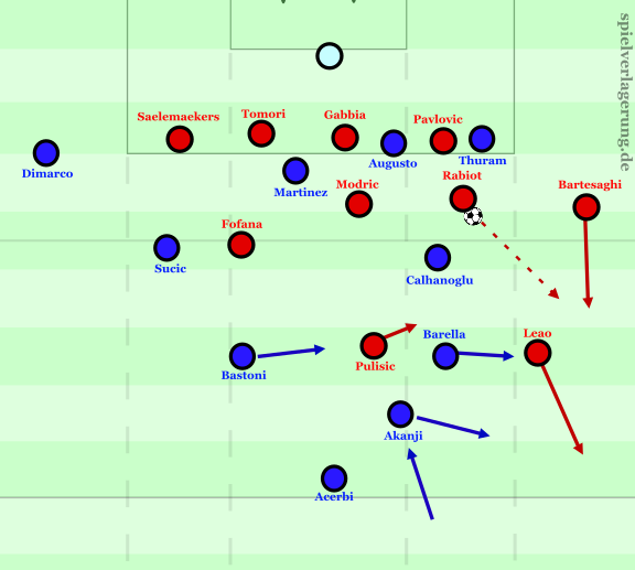 Anfangs bereitete das Inter durchaus noch Probleme, weil Pulisic den Außenspieler zwar nicht konsequent band, die Übergaben jedoch unklar blieben. Mehrmals schob Akanji diagonal nach innen in eine mannorientierte Bewegung auf Pulisic und öffnete damit enorme Räume in seinem rechten Rücken. Insgesamt tat sich Schwarz-Rot in dieser Phase aber schwer, diese hohen Räume sofort und zielgerichtet zu bespielen. Das lag vor allem an der tiefen Positionierung der weiteren Angreifer, deren Fokus stärker auf dem Muster „Pulisic bindet, Leão dribbelt, zieht Gegner und öffnet die Breite“ lag. Mit der Zeit übergab Inter Pulisic dann vermehrt an den ballferner einrückenden Bastoni. Dadurch konnte Akanji tiefer bleiben und Leão mehrfach am inversen Dribbling hindern – teilweise auch durch taktische Fouls. Insgesamt blieben diese Dribblings aber etwas zu isoliert, was – wie beschrieben – vor allem am zu wenig temporreichen Nachschieben Bartesaghis lag und zudem daran, dass Pulisic häufig zu tief agierte.