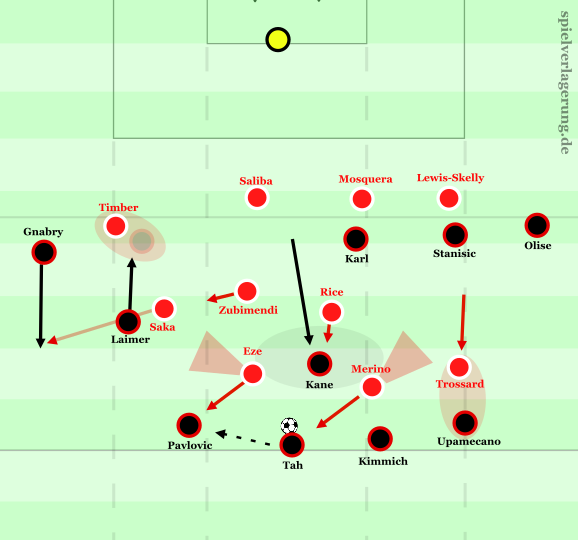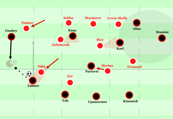 Insgesamt unterband Arsenal bei Gnabrys Ballaktionen – wohlwissend, dass er die Tiefe aufgrund von Timbers Verfolgungswinkel kaum bespielen konnte – auch die Passwege ins Zentrum sehr konsequent. Besonders die Achter stellten die Anspielstationen auf Kane und Karl exzellent zu. In diesem Zusammenhang ist auch das Scanning hervorzuheben sowie die Rolle der Innenverteidiger, die präzise einschätzen konnten, wann Kane und Karl durch die Achter isoliert waren und wann sie selbst mannorientiert herausrücken mussten. Bemerkenswert war zudem das Zusammenspiel von Merino und Saka: Da der Raum zwischen Mittelfeld- und Angriffslinie bei Arsenal weiterhin leicht anfällig blieb und Pavlović sich zunehmend dorthin bewegte, versuchte Saka bei Gnabrys Ballbesitz mit horizontaler Körperstellung den Passweg in den Sechserraum gezielt zu unterbinden und löste dabei seine Mannorientierung auf Laimer – da dieser in der Tiefe (durch den Pressingwinkel Timbers) ohnehin kaum mehr anspielbar war. Wurde Pavlović hingegen nicht darüber gebunden, übernahm Merino dessen Absicherung und markierte ihn mannorientiert.