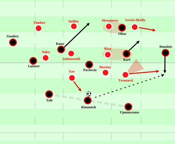 Man kann Timber vielleicht vorwerfen, dass er sich so sehr auf die Isolation der Tiefe konzentrierte, dass er im direkten Duell zu Gnabry teils etwas zu großen Abstand hielt und dadurch inverse Dribblings des Deutschen nicht konsequent unterbinden konnte. Zwar konnte Gnabry aufgrund des Ausschiebens von Zubimendi nicht ins Zentrum eindribbeln, dennoch gelang ihm mehrfach eine Verlagerung in die Breite. Dort verfügte Bayern nominell gegen Lewis-Skelly mit Olise und Stanisic über eine einfache Überzahl, und meist suchte Gnabry dann Olise, während Stanisic im Halbraum durchschieben sollte. Problematisch war jedoch weiterhin, dass Lewis-Skelly Olise sehr gut in der Breite isolierte und die horizontalen Wege im Halbraum effektiv blockierte. Zudem fehlte Stanisic teils das Tempo, um den Zwischenraum zwischen Mosquera und Lewis-Skelly direkt zu belaufen, sodass Trossard ihn im Rückwärtspressing meist aufnehmen konnte und Olise im 1-gegen-1 isoliert blieb, wodurch er in den ersten Phase nur wenig Dynamik entwickeln konnte.