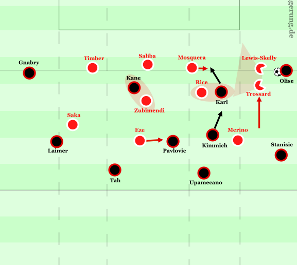 Wenn die Abstände zwischen Lewis-Skelly und Trossard es zuließen – also meist eher im direkten Aufbau von rechts und nicht nach Verlagerungen – versuchte Arsenal häufig, ein 2-gegen-1 gegen Olise im Überzahlpressing zu bilden. Trossard isolierte dabei den Dribbling- und Passweg horizontal und sperrte so das Zentrum ab, während Lewis-Skelly sich auf das Schließen des Dribblingweges vertikal an der Linie konzentrieren konnte beziehungsweise die tiefen Laufwege von Karl im Halbraum isolierte. Arsenal konnte sich diese Vorgehensweise insbesondere auf der rechten Seite erlauben, da Stanisic deutlich weniger eng mannorientiert agierte als Laimer auf der linken Seite. Stanisic zeigte im Spielaufbau deutlich weniger aktive Durchschiebebewegungen und blieb meist rücksichernd für Rückpässe, sodass Trossard ihn nicht wie Saka auf Laimer verfolgen musste. Später schob Stanisic gelegentlich im Halbraum höher und band so auch Trossard. Dann hatte Lewis-Skelly gelegentlich Probleme, die inversen Bewegungen von Olise zu verteidigen, konnte sich aber meist mit taktischen Fouls helfen (eine frühe gelbe Karte dafür hätte das Spiel durchaus drehen können).