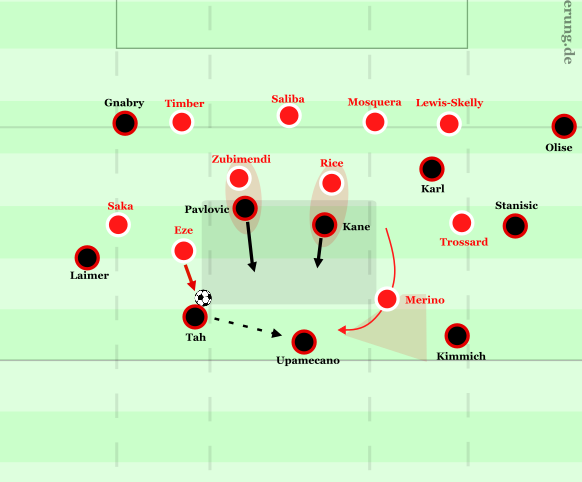 Tatsächlich schaffte es Bayern nach ein paar Minuten, Arsenals erste Pressinglinie über Anspiele in den Zwischenraum zu manipulieren. Das gelang vor allem dann, wenn beide Achter Arsenals gebunden werden konnten – meist durch die Abkippbewegungen von Kane und Karl im Halbraum, die bewusst zur Bindung genutzt wurden. Dadurch fehlte die zentrale Isolation für Dribblings im Zwischenlinienraum, sodass auch ein Aufdrehen möglich war. So musste insbesondere Merino ein paar Mal zentral auf Pavlović herausrücken, damit dieser nicht aufdrehen konnte. Tendenziell hatte das vor allem den Effekt, dass Merino aus dieser tieferen und engeren Position teilweise nicht aktiv das Pressing auf den mittleren Innenverteidiger auslösen konnte. Dadurch wurde die zuvor initial isolierte rechte Seite der Bayern wieder direkt bespielbar.