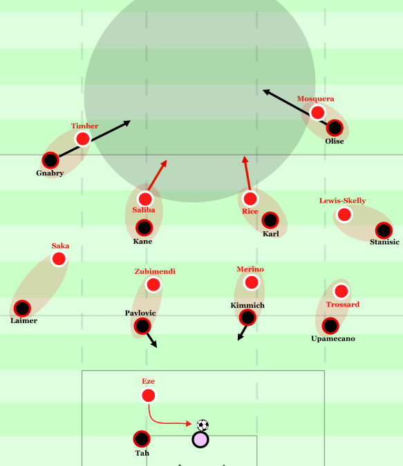 Tendenziell hatten aber gerade Laimer im Zusammenspiel mit Kane und Gnabry etwas Probleme, weil Saliba weiterhin die Bewegungen in den Rücken Timbers gut verfolgte und sie dadurch kaum in die Breite – und damit auch nicht in die Tiefe – aufdrehen konnten. Später agierte Gnabry in der Breite zudem immer wieder etwas tiefer und konnte so relativ früh das Dribbling gegen Timber suchen. Dieser hatte aus größerer Distanz gegen den dribbelnden Gnabry einige Probleme und konnte den inversen Weg nicht sauber schließen, sodass sich mehrfach interessante Tiefenoptionen ergaben.