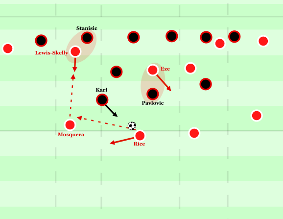 Jedoch hatte Stanišić trotz des weiten Pressingwegs und des sehr seitlichen Pressingwinkels eigentlich enorme Vorteile, doch er schaffte es kaum, diese zu nutzen. Gleichzeitig isolierte Arsenal über das Ausschieben von Lewis-Skelly in die Breite den Vertikalpass auf Olise im Halbraum, der zudem von Mosquera mannorientiert aufgenommen wurde. Auch Rice schob bei Karls Bewegungen im Halbraum eng mit, sodass Stanišić – der insgesamt nur ungern Dribblings sucht – häufig den Rückpass auf Upamecano wählte.