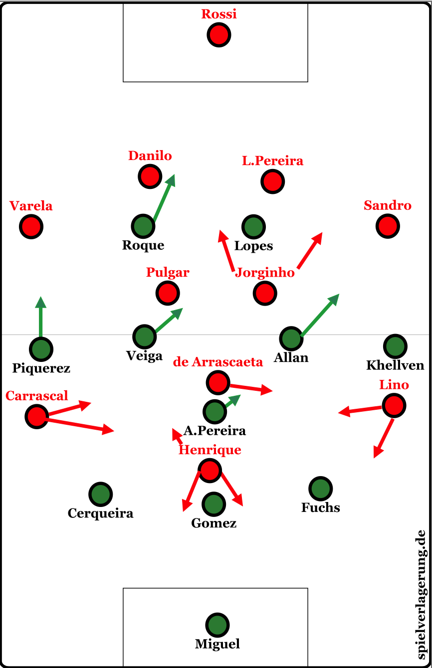 Interessant war die Stafflung des Dreiermittelfelds hinter der ersten Pressinglinie. Der linke Achter Veiga agierte vor der Auslösung zwischen Pulgar und Jorginho. Während der Auslösung orientierte sich dieser mannbezogen auf den ballnahen Sechser Pulgar. Dadurch sollte nach dem erzwungenen Pass in die Breite der erneute Weg ins Zentrum isoliert werden. Lopes rückte als ballferner Stürmer auf Jorginho ein. Sechser Pereira setzte sich aufgrund der Hybridrolle von Veiga als +1 Überzahlspieler zentral ab. Der rechte Achter Allan lauerte als rechter Außenspieler agierend auf Zugriff auf Sandro. Die Mittelfeldreihe agierte so stark asymmetrisch nach rechts verschoben.