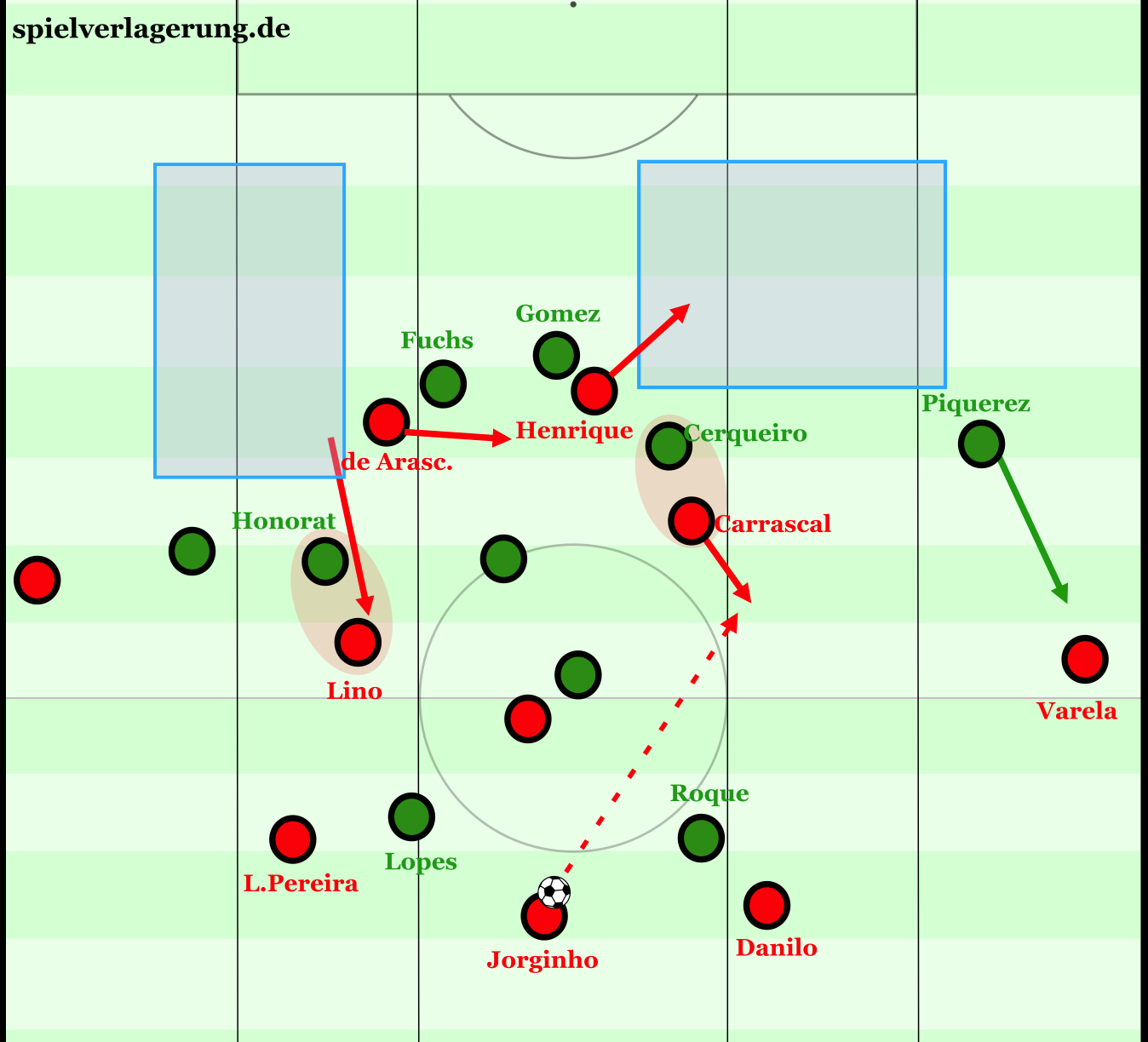 Diese Passivität nutzte Flamengo für stärkere Rotationen der Offensivreihe. Die Außenstürmer rückten ein und sorgten für engere Abstände, was die Rotationen begünstigte. Auch die Außenverteidiger Flamengos reagierten auf den konstanteren Dreieraufbau und schoben etwas höher. Gerade Varela diente so für Carrascal in seinen Dribblings mit Rücken zum Tor als drucklösende Option. Dieser konnte im Anschluss den durch das Dribbling von Carrascal geöffneten Raum im Halbraum bedribbeln und den Tiefenball auf Henrique hinter den rausrückenden Gomez und Cerqueira suchen. Dies führte zur größten Chance im ersten Durchgang durch Henrique.