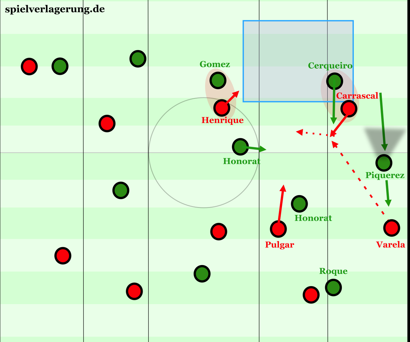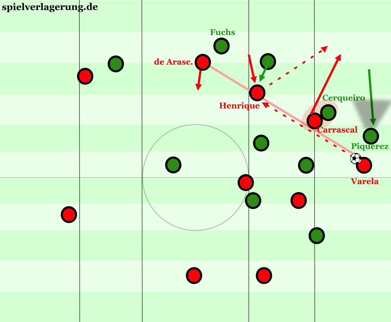 Die unbesetzte linke Seite war, gerade da Roque gegenüber Lopes der aktivere Spieler im Auslösen war, ein Problem.  Diese Lücke sollte bei Anspiel auf Varela Piquerez schließen. Piquerez musste jedoch aus der Kette einen weiten Pressingweg zurücklegen, um Varela effektiv unter Druck zu setzen. Dieser lange Pressingweg gab Varela einen entscheidenden Zeitvorteil, den dieser nutzte, um sich aufzudrehen. Zudem löste Roque ein paar Mal zu stürmisch auf eigene Faust aus, was den Zeitnachteil von Piquerez weiter vergrößerte. Das Problem des Zeitvorteils war aufgrund der Höhe der Außenverteidiger Flamengos vorhersehbar. Umso unverständlicher ist daher die tiefe Startposition von Piquerez. Dadurch, dass dieser zusätzlich aus der Breite heraus startete, erfolgte das Anlaufen in einem vertikalen Pressingwinkel, wodurch der diagonale Passweg in den Halbraum nicht isoliert wurde.