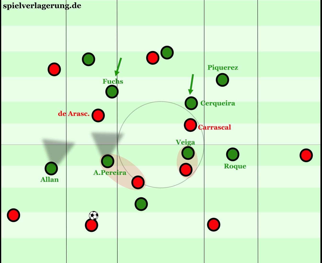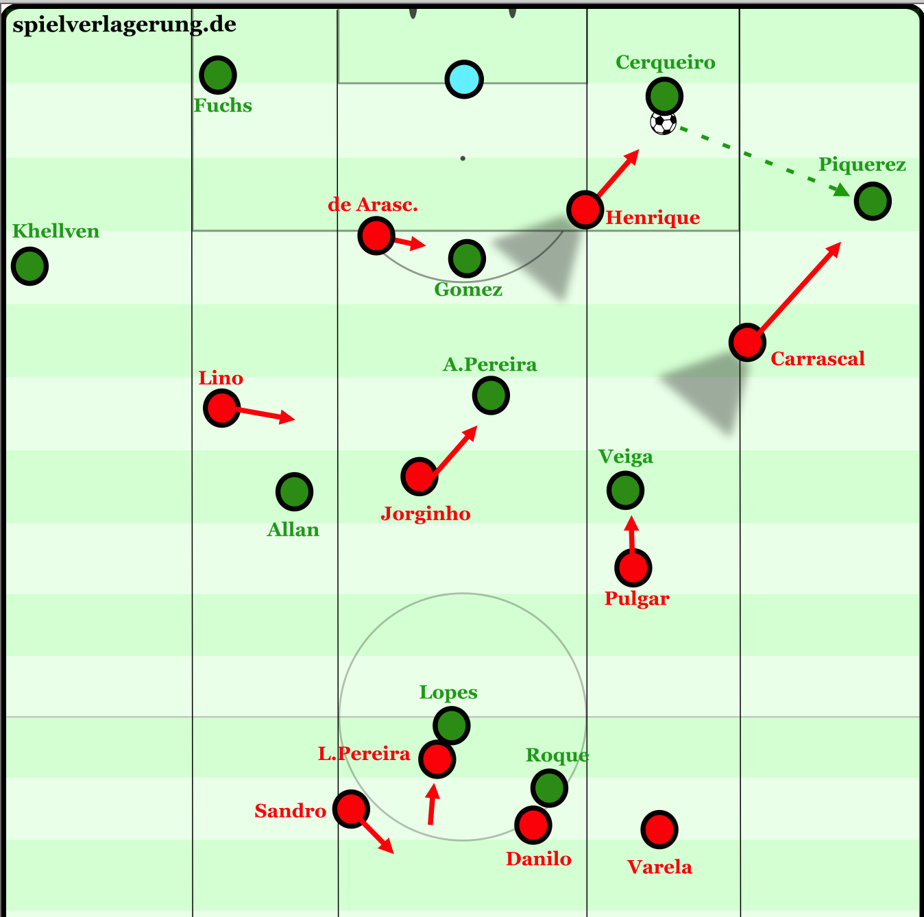 Im Bespielen der Halbräume zeichnete sich im Laufe der ersten Halbzeit ein Fokuswechsel auf die linke Seite ab. Dies lag vor allem an den Reaktionen der Stürmer von Palmeiras auf die zunehmende Passivität gegen den Dreieraubau. Lopes wurde in der blockenden Rolle auf L.Pereira bei langem Ballhalten von Jorginho ungeduldig. Lopes ließ sich von Jorginho locken. Allerdings war der Pressingwinkel auf diesen nicht bogenförmig genug, wodurch Jorginho den eigentlich initial isolierten Pass auf L.Pereira an der Auslösung von Lopes vorbei spielen konnte.