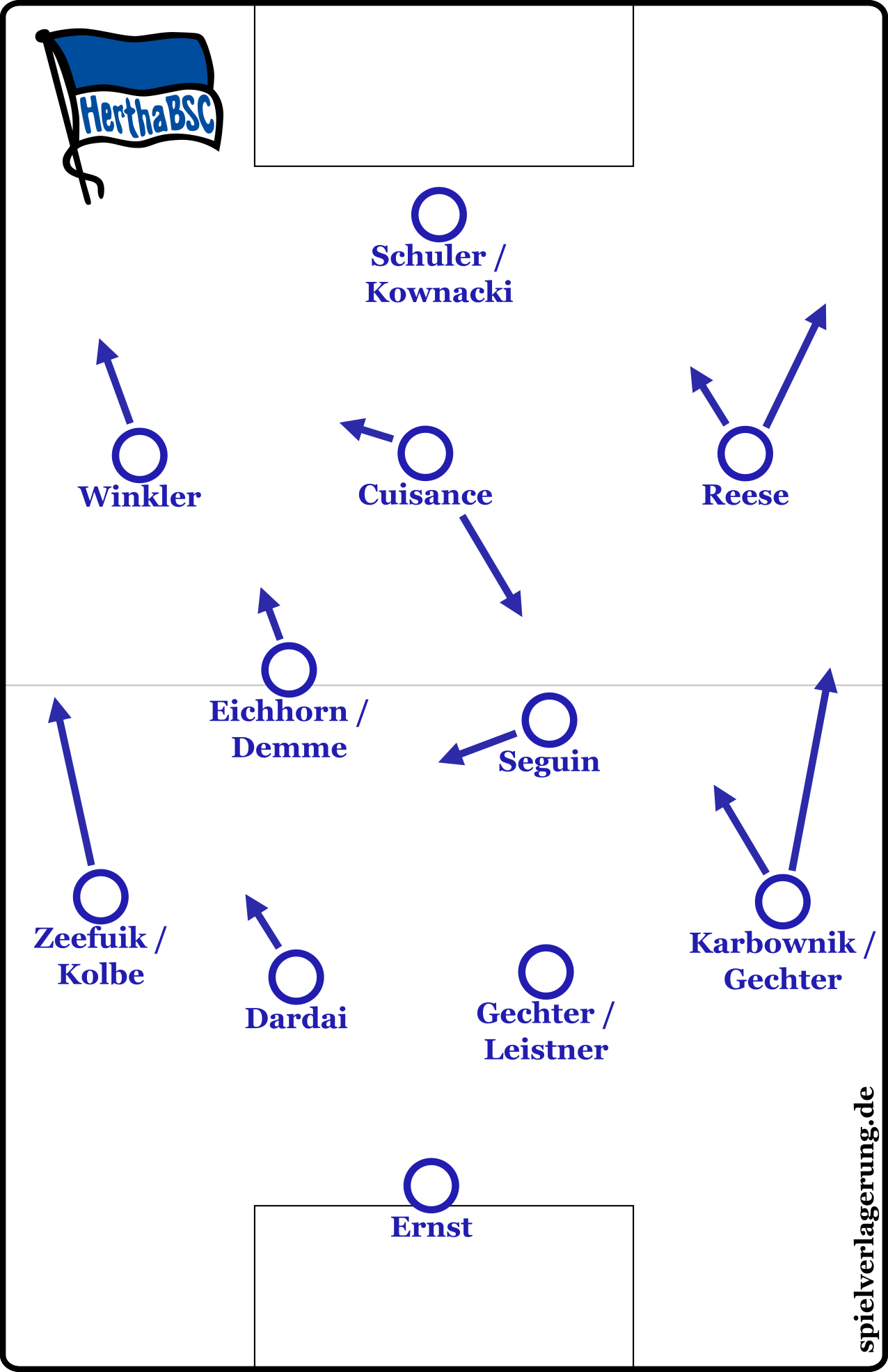 Im strukturellen Aufbau strebt Hertha eine 2-3-Anordnung an, um die eigene Restverteidigung zu stabilisieren und Anspielpunkte im Zentrum zu sichern. Neben flachem Aufbau nutzt die Mannschaft immer wieder lange Bälle hinter die gegnerische Abwehrkette, insbesondere aus dem zweiten Drittel auf die Flügel, um Tempovorteile auszuspielen und Umschaltmomente gezielt zu verlängern.