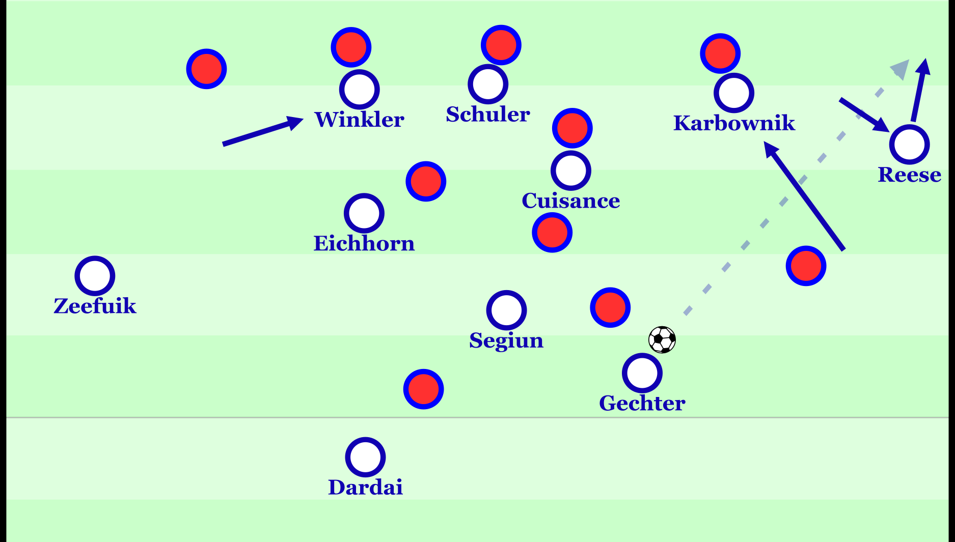 Auch die personellen Rollen in diesem System greifen klar ineinander. Die Außenverteidiger Zeefuik, Gechter, Karbownik und Kolbe agieren defensiv orientiert und sichern die Flügel ab. Im Umschaltmoment wartet Schuler als zentraler Stürmer hoch in der Restverteidigung des Gegners, um sofort Tiefenläufe starten und direkte Gefahr erzeugen zu können. Dahinter positioniert sich Cuisance als Verbindungsspieler, der im Zentrum nah am gegnerischen Verteidigerblock agiert und als kreative Option die ersten Kontakte im Konter übernimmt. Auf den Außenbahnen bringen die schnellen Winkler und Reese die nötige Tiefe, um Herthas Konterspiel maximal gefährlich zu machen.