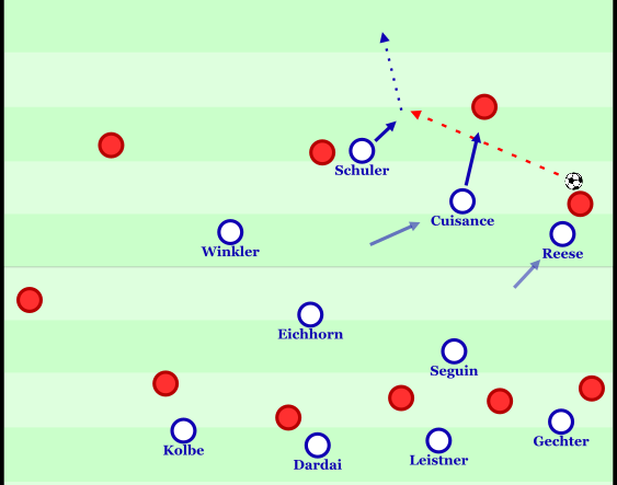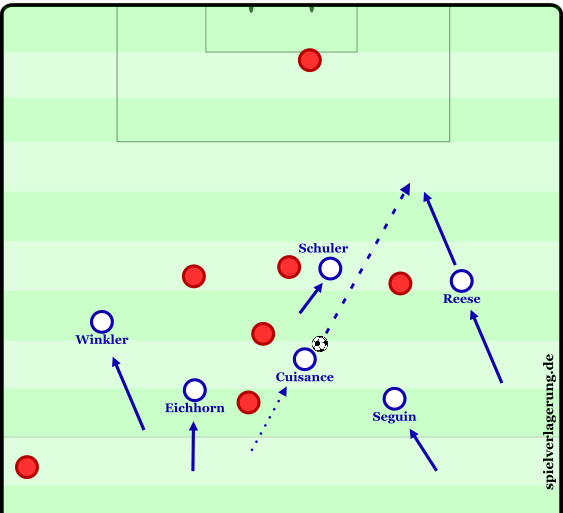 Umschaltmoment der Hertha gegen Kaiserslautern: Eichhorn gewinnt den Ball im Zentrum passt den Ball auf Cuisance der im raumübergreifenden Dribbling Reese und Winkler ermöglicht den Raum in der letzten Linie über die Flügel zu attackieren. In diesem Beispiel kommt nach einem technischen Fehler eines lauterer Verteidigers Schuler zum Abschluss.