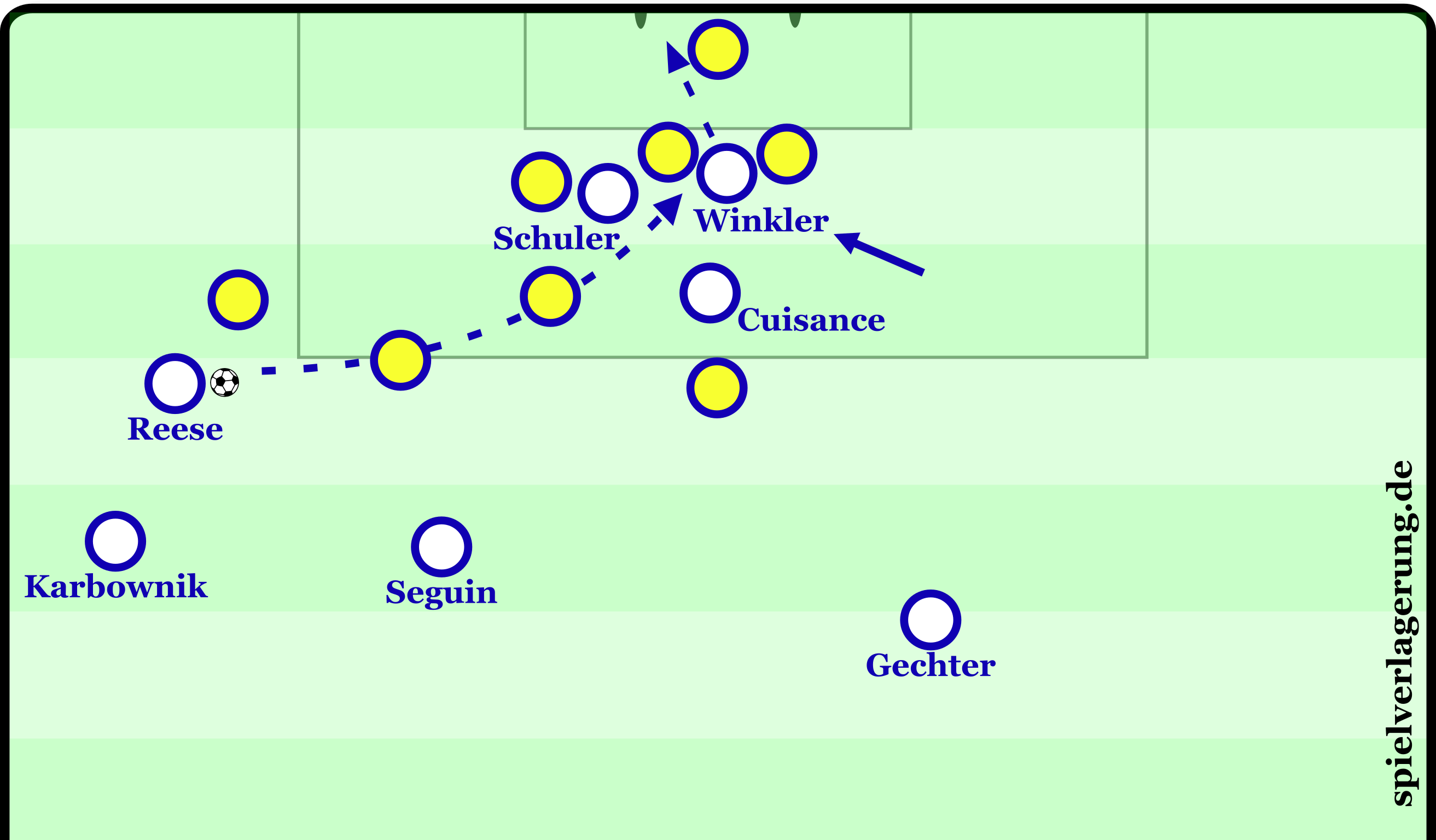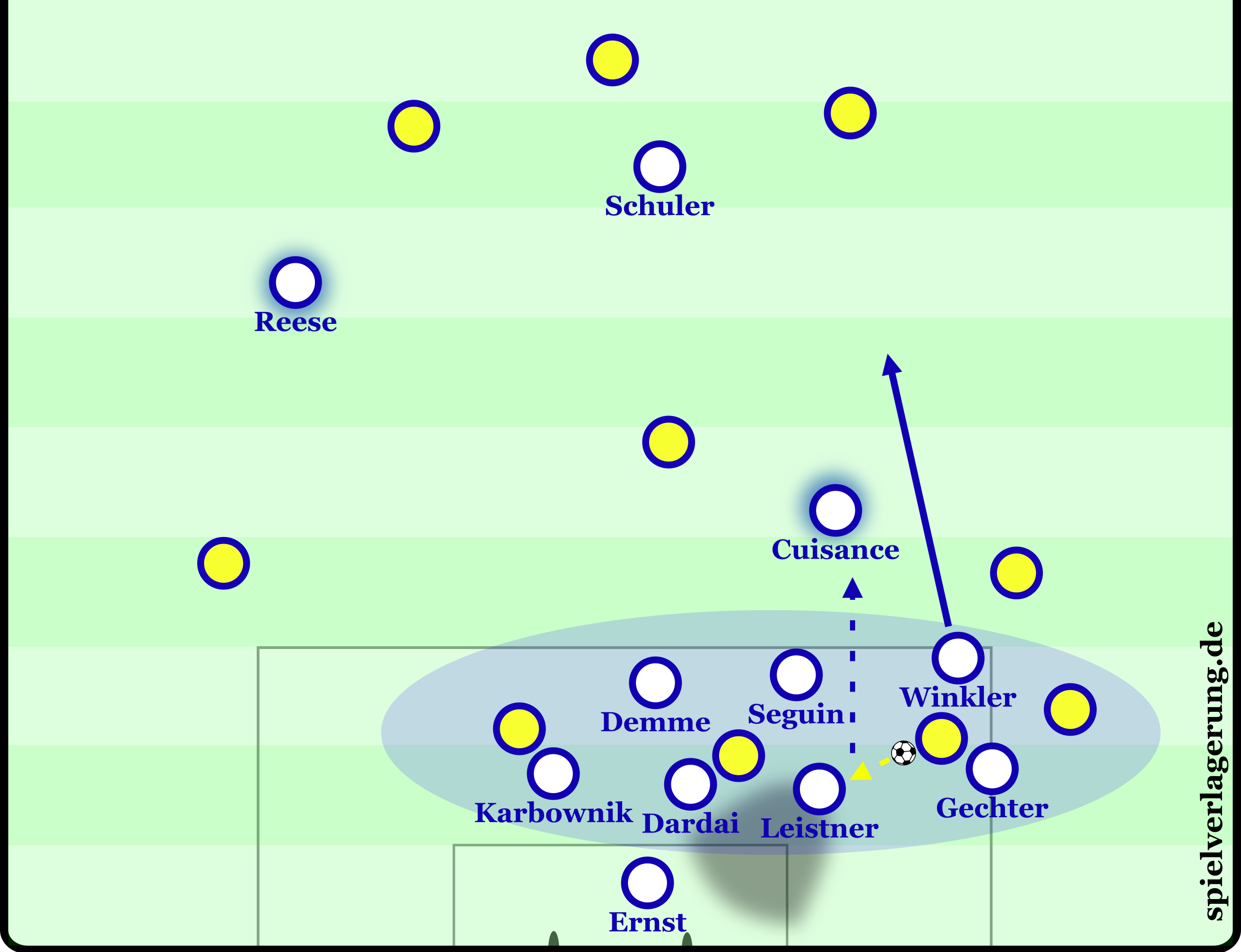 Von dort aus tragen Reese oder Winkler den Angriff mit hohem Tempo weiter. Ihre Dynamik ermöglicht es Hertha, große Räume in kürzester Zeit zu überbrücken und die gegnerische Defensive in Rückwärtsbewegung zu zwingen. Gleichzeitig bietet Schuler als Wandspieler in der letzten Linie eine tiefe Option an. Durch seine Positionierung unmittelbar an den Innenverteidigern kann er direkt angespielt werden, entweder um den Ball prallen zu lassen, oder um selbst den tiefen Lauf fortzuführen. Diese Kombination aus Zentrum, Flügel und Spitze erzeugt ein vertikales Dreieck, das Hertha im Umschalten besonders gefährlich macht.