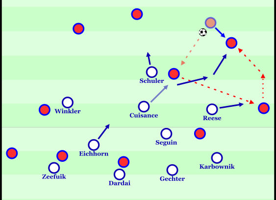 Eine entscheidende Rolle kommt dabei den Halbräumen im zweiten Drittel zu, die Hertha bewusst bespielt, sobald die Flügelspieler den Ball in flacherer Position erhalten. Cuisance bietet sich regelmäßig in den Halbräumen an, wo er die Verbindung zwischen Flügel und Zentrum herstellt. Einer der beiden Sechser schiebt ebenfalls in diesen Raum vor und bindet dabei die gegnerische Mittelfeldlinie, sodass Passoptionen entstehen. Diese Bewegungen greifen flüssig ineinander und geben besonders Reese am Flügel mehr Zeit und Raum für seine Aktionen, da die gegnerische Defensive durch die vertikale Dynamik gebunden wird.