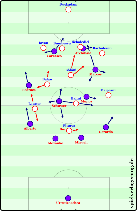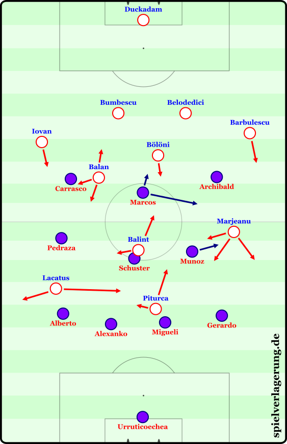 Asymmetrisch liefen die beiden Formationen damit fast wieder auf eine Vielzahl von 1gegen1-Zuordnungen mit jeweils einem freien Mann in der letzten Linie zu. Weil mitunter der rotierende Marcos Alsonso hinzukommen konnte, waren typischerweise beide Außenverteidiger der Rumänen hinten in der Kette gebunden. Dort bildeten sie eine 4gegen3-Überzahl, die stets für eine numerische Absicherung sorgte und situativ auch Libero-Verhaltensmuster ermöglichte. Wichtig war in diesem Zusammenhang die Rolle von Steauas hinterstem Mittelfeldspieler Bölöni, der schnell von oben nacharbeitete, die Kette zusätzlich gegen Bälle in kompakte Staffelungen des katalanischen Offensivtrios unterstützte und aufmerksam den Rückraum sicherte. Solange Muñoz primär absicherte, konnte er praktisch zu einem weiteren freien Mann und Zusatz-Libero von oben werden.