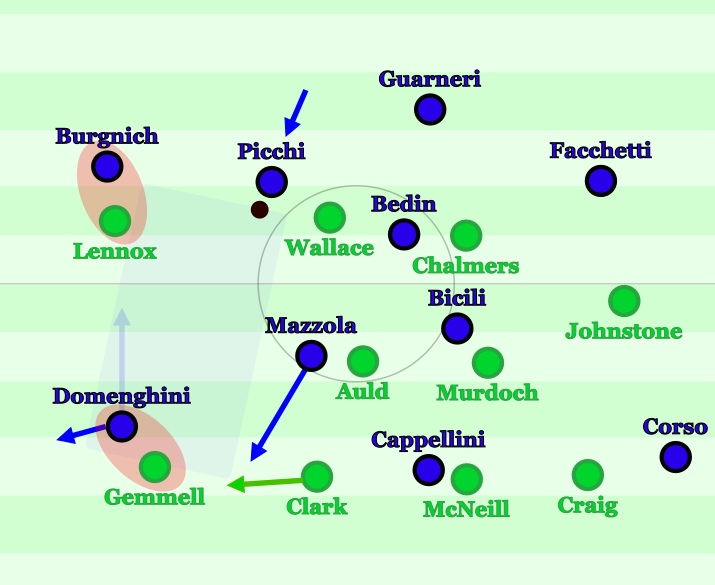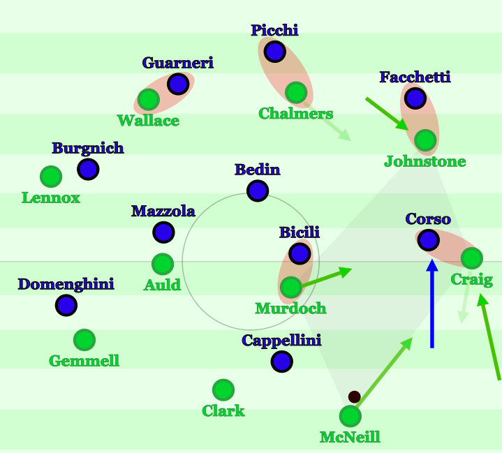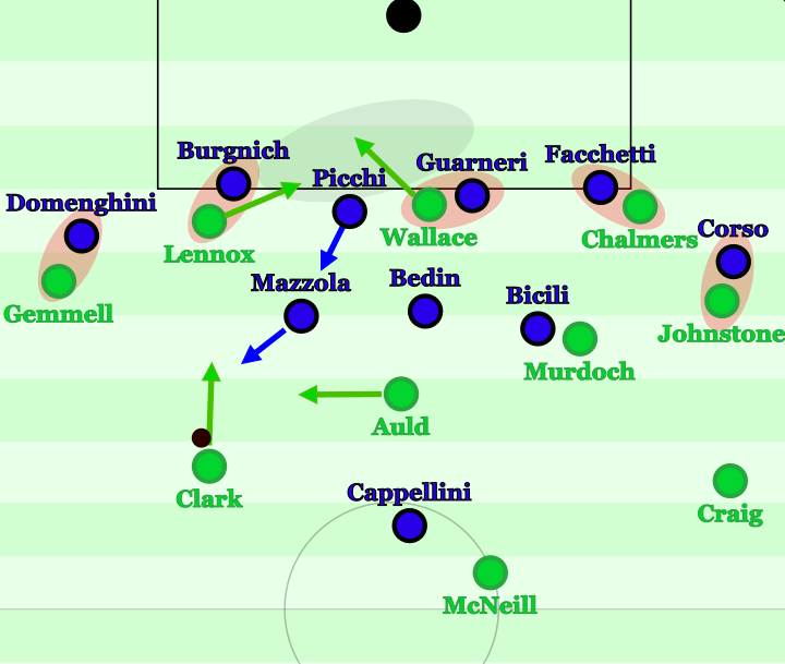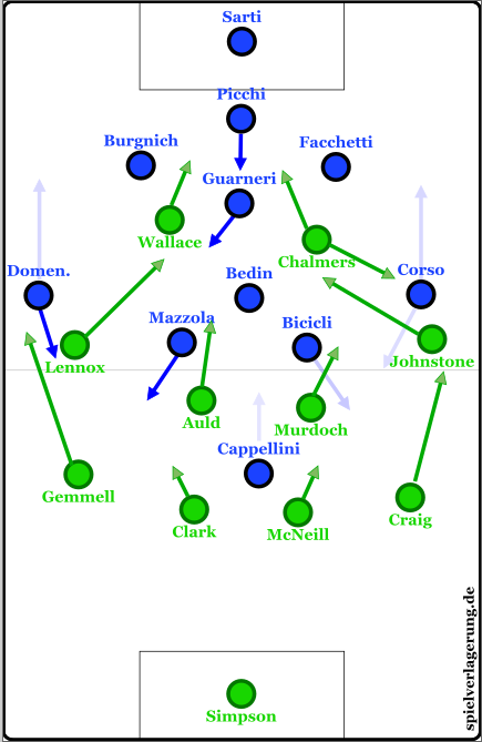 Dieses manndeckende Herausrücken in der Breite öffnete jedoch immer wieder Passwege in den Halbraum. Besonders hängender Stürmer Chalmers wurde dort diagonal im linken Halbraum angespielt und versuchte, im Wandspiel den Ball festzumachen. Libero Picchi tat sich anfangs schwer, die Drehungen Chalmers aus der Manndeckung heraus zu unterbinden und hatte Probleme in der Balance gegen den dynamischen Chalmers, sodass dieser immer wieder ins Zentrum aufdrehen und eindribbeln konnte. Tendenziell fehlte den Schotten in den ersten Minuten jedoch noch der letzte Anschluss: Zweiter Stürmer Wallace wurde eng von Innenverteidiger Guarneri markiert, und so fehlte Chalmers etwas der zentrale Anschluss.